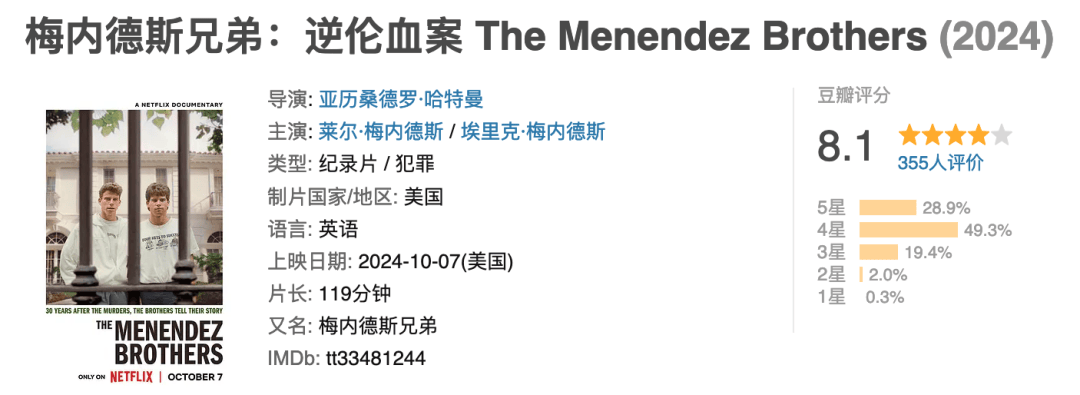 1996 年,莱尔·梅内德斯和埃里克·梅内德斯因谋杀父母被判有罪,这起案件成为 20 世纪末最著名的刑事案件之一。30 年来,两兄弟首次现身说法,回顾了这场震惊全国的审判。阿根廷著名导演亚历桑德罗·哈特曼(《谁杀了玛丽亚?》、《摄影记者之死:阿根廷黑金政治》)对莱尔和埃里克、参与审判的律师、报道审判的记者、陪审员、家人和其他知情观察员进行了大量音频采访,提供了新的见解和独特视角,让人们重新认识这起他们自以为了如指掌的案件。