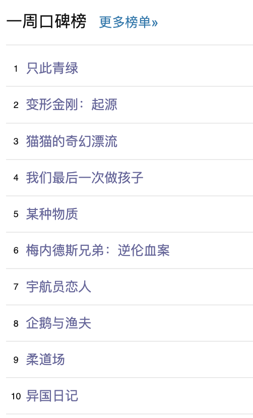 另外,豆瓣电影的一周口碑榜同样在更新中,当然,我们还是先关注下院线片部分吧。