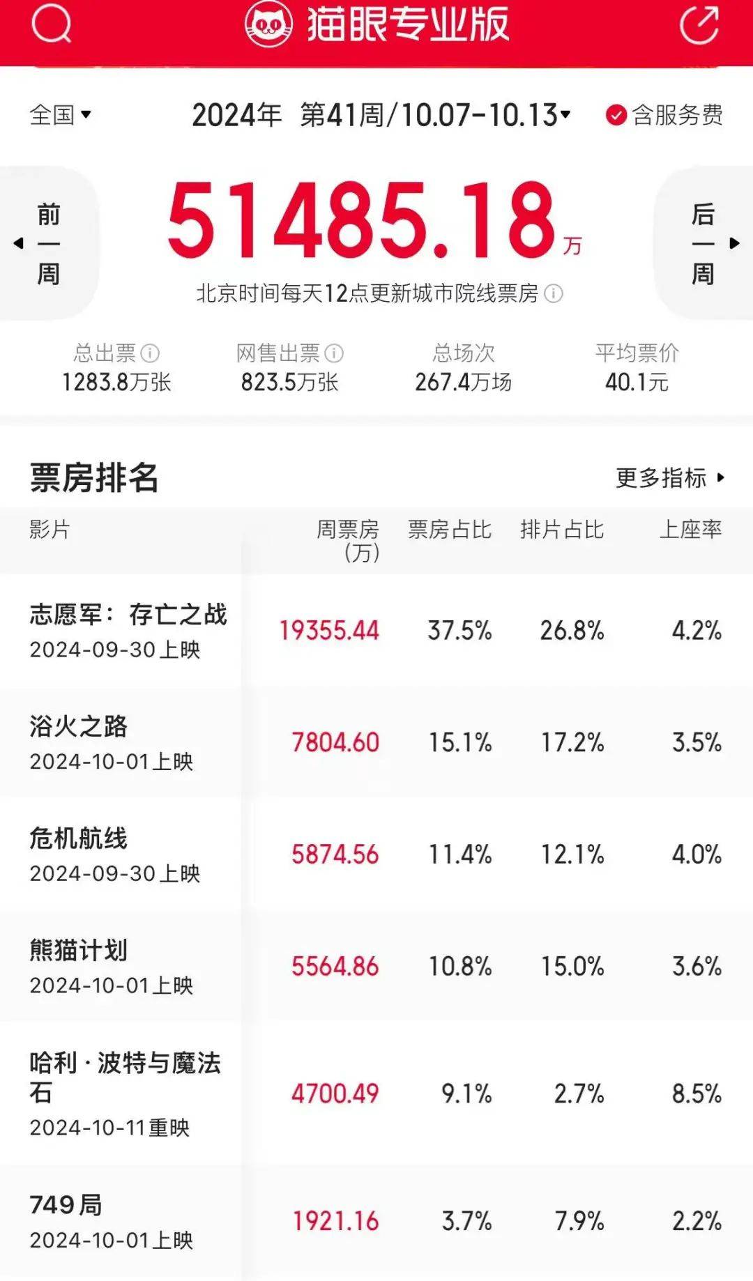 而上周内地票房的整体情况,还是基本没有太大变化,《志愿军:存亡之战》仍是遥遥领先。