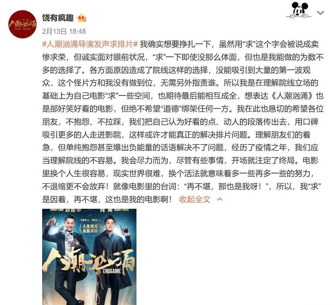 2021年春节,《人潮汹涌》导演饶晓志发微博求排片