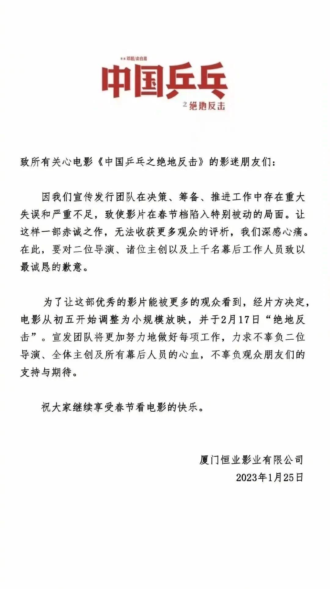 2023年春节档,《中国乒乓之绝地反击》也有过类似的操作, 这部由邓超、俞白眉共同执导的电影,经历了“定档-改档-上映-撤档-重新上映”多次波折。