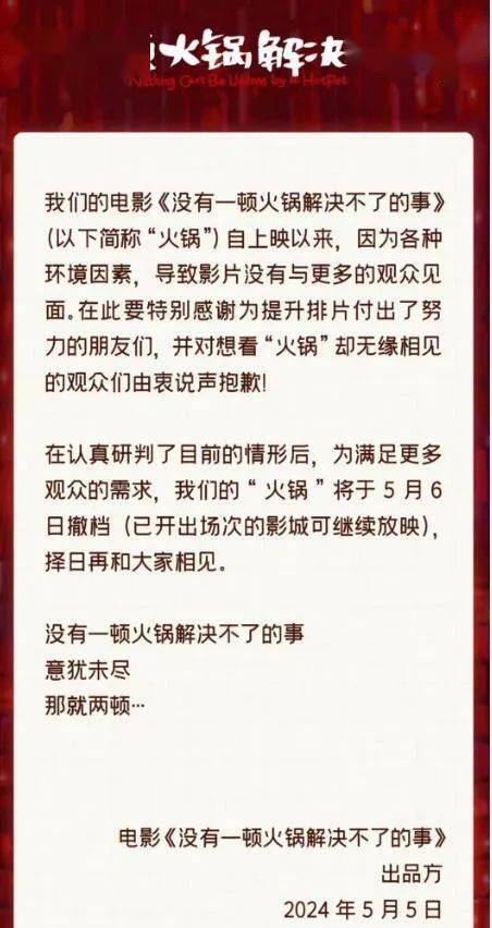 比如由丁晟执导,杨幂、于谦等主演的电影《没有一顿火锅解决不了的事》(下称《火锅》),在今年五一假期的最后一天宣布撤档。