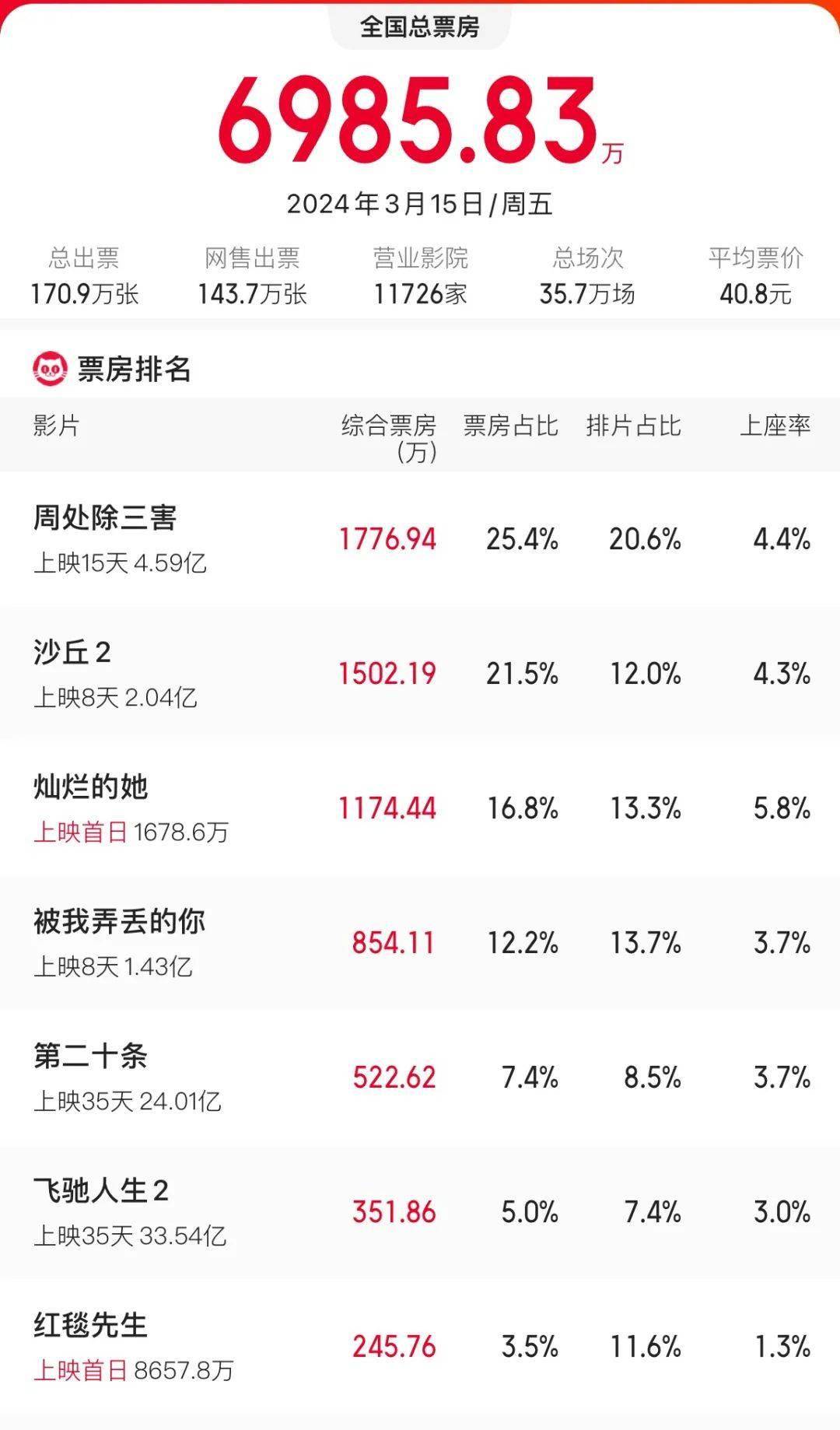 《红毯先生》3月15日重映票房,数据来源:猫眼专业版