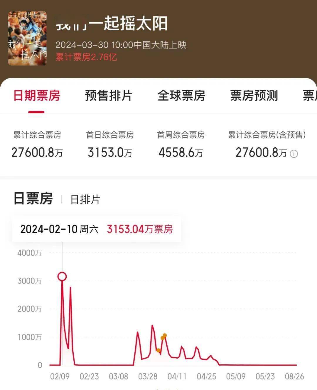 再看看同在今年春节档上映的《摇太阳》,首轮票房9314.3万,撤档后于3月30日重映又收获1.83亿票房,最终票房成绩为2.76亿。
