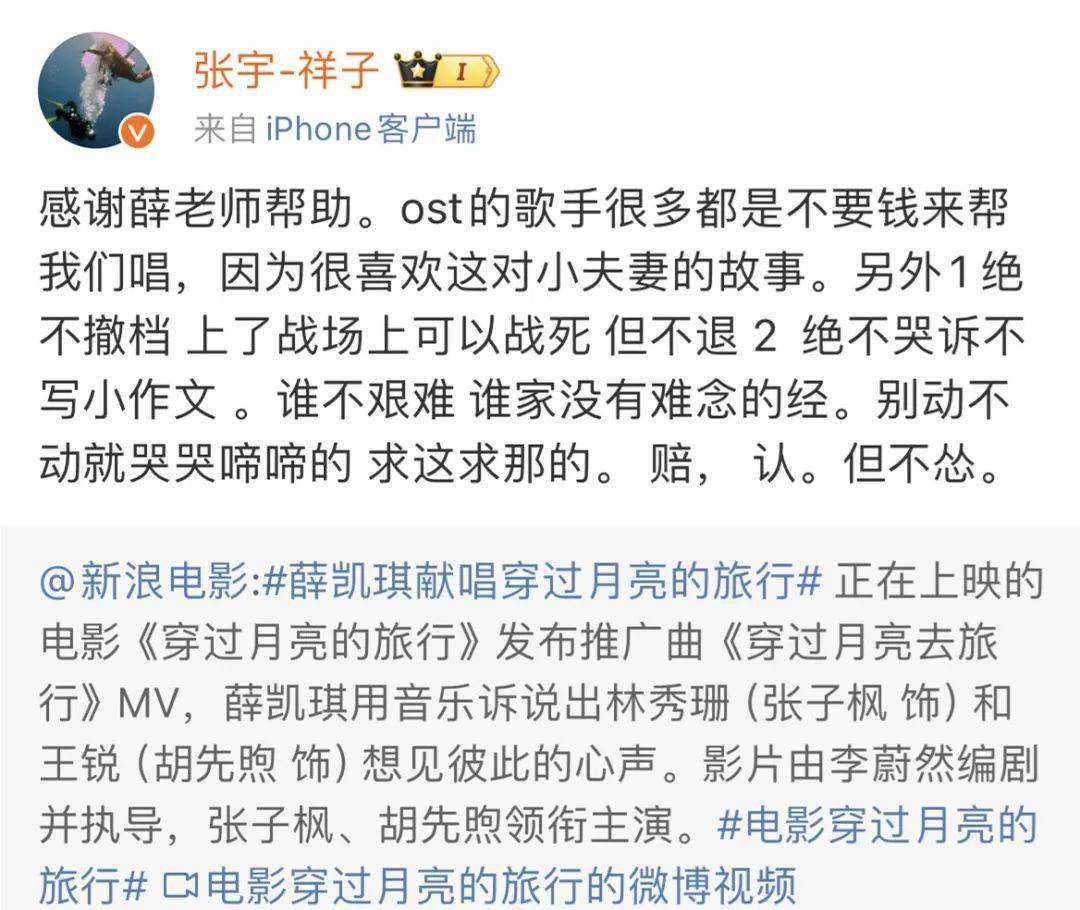 比如今年五一档上映的电影《穿过月亮的旅行》,在档期的票房只能算垫底,但制片人张宇却在微博直言 “ 赔,认,但不怂。”