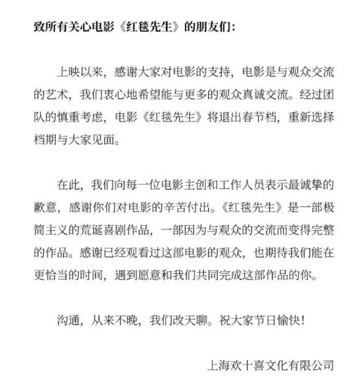 片方在撤档声明中表示:“自上映以来,因为各种环境因素,导致影片没有与更多的观众见面。”
