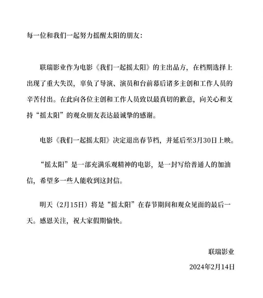在撤档声明中,《摇太阳》出品方联瑞影业承认“ 在档期选择上出现重大失误,辜负了影片主创和工作人员的辛苦付出。”
