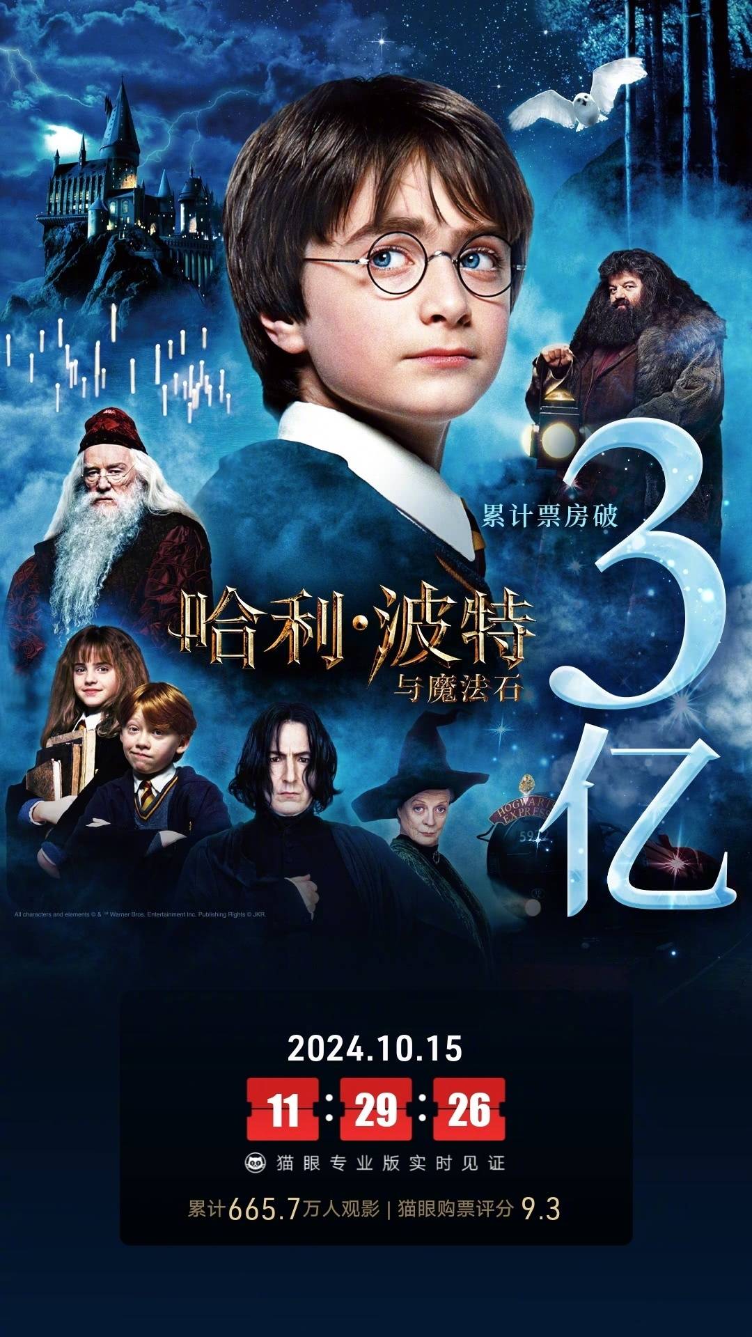 搜狐娱乐讯 据猫眼专业版数据,截至10月15日11:29,《哈利·波特》全系列中国内地重映之第一部《哈利·波特与魔法石》中国内地票房突破3亿元,包括2002年首映(票房5600万) 2020年重映(1.92亿) 本轮重映。