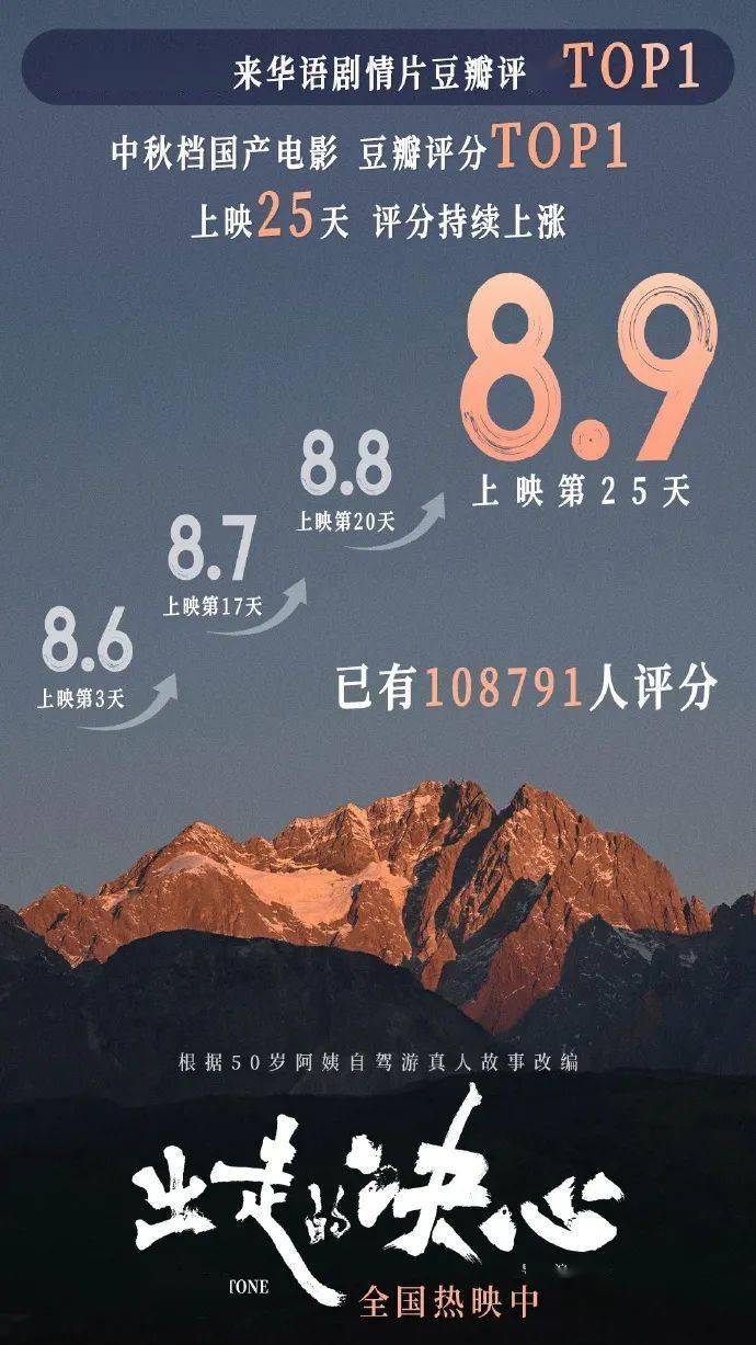 同样在9月登场的另一部作品《出走的决心》,根据苏敏阿姨自驾游的真人故事改编,从中秋档上映一个月以来,豆瓣评分也持续上涨, 从开分8.6升高到目前的8.9分,成为自2020年以来华语剧情片豆瓣评分第一。