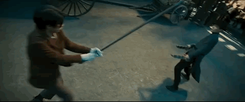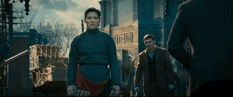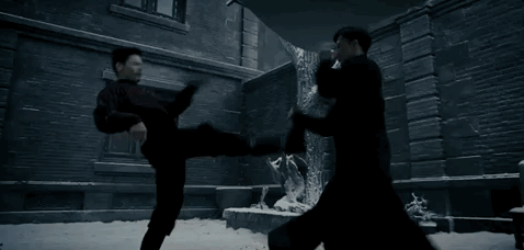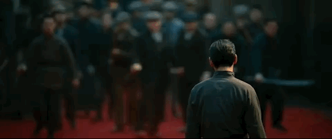 他要去约架,武馆的人劝他不要去,他不听,坚定地向前一步,然后又把手举向空中,伸出两根手指。