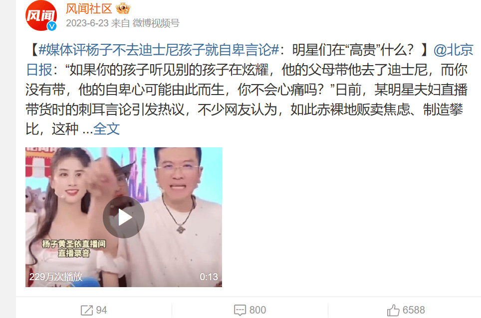 夫妻俩的一些发言比较的迷惑,比如说有一次,杨子提到没有带孩子去迪士尼,孩子可能会觉得丢脸、自卑之类的,又让人们对他的三观产生了不满。