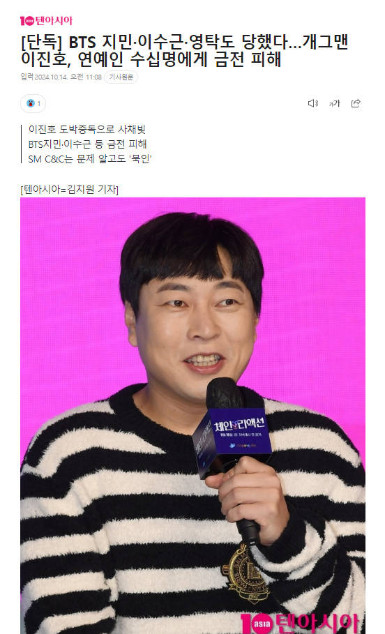 搜狐娱乐讯 10月14日,据韩媒报道,韩国搞笑艺人李陈镐非法赌博诈骗上亿韩元。据悉,在李陈镐因非法赌博欠下上亿韩元债务的情况下,防弹少年团朴智旻、英卓、李寿根等被李陈镐欺骗借钱从而遭受损失。