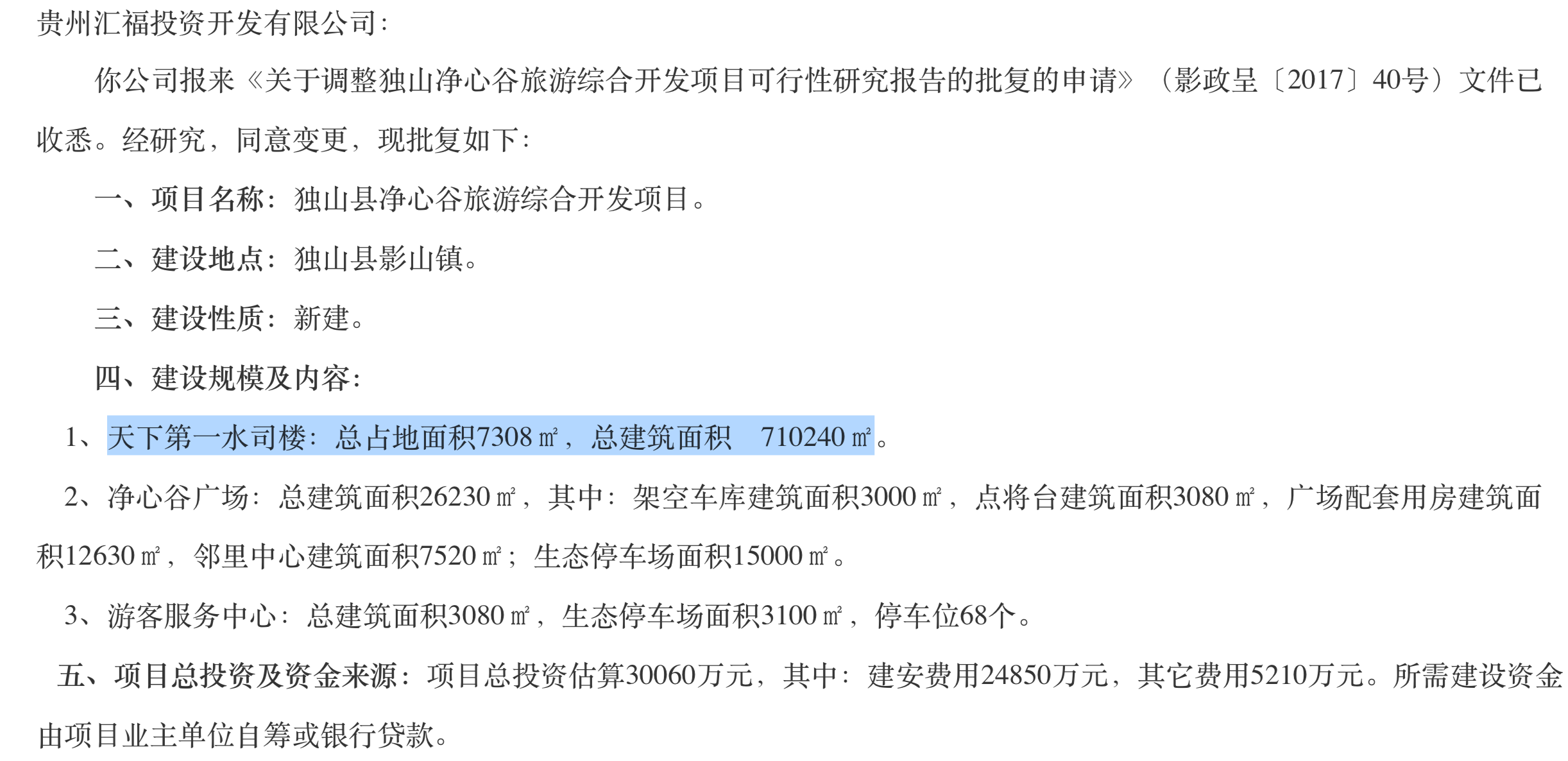 据独山县政府2017年7月9日发布的一则《关于调整独山县净心谷旅游综合开发项目可行性研究报告的批复》,该项目包括水司楼与净心谷广场、游客服务中心,总投资估算逾3亿元,其中建安费用为2.5亿元,所需建设资金由项目业主单位自筹或银行贷款。
