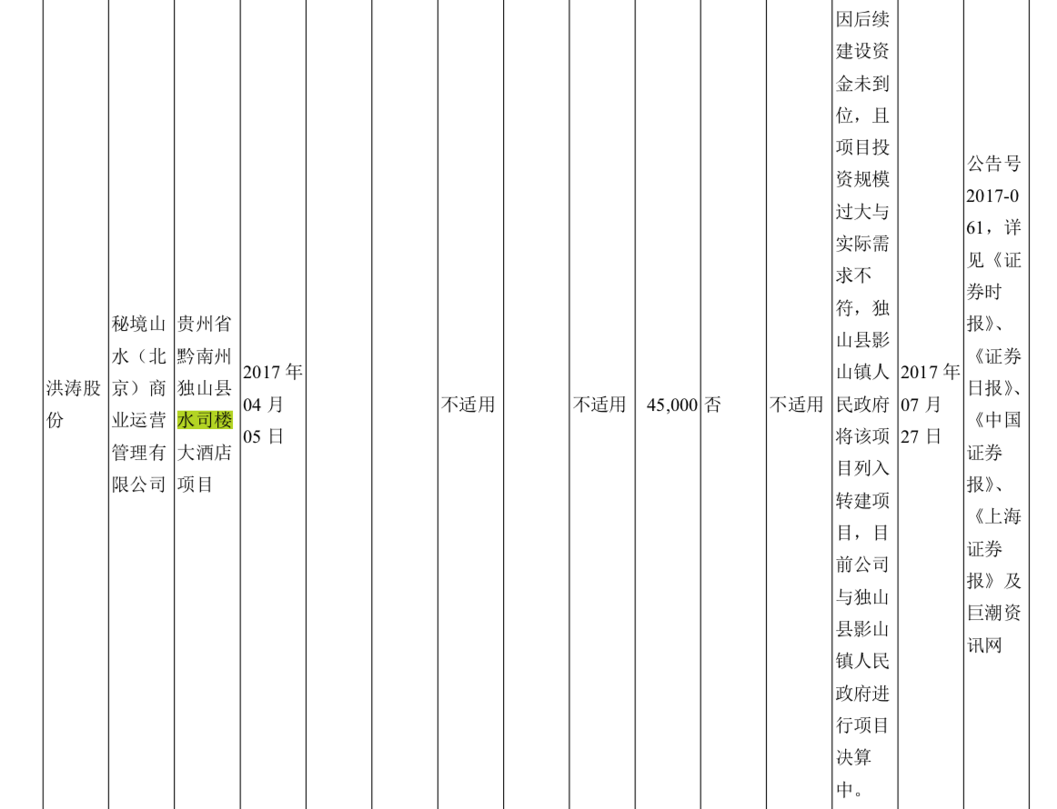 2019年年报却显示,这项水司楼项目被列入了洪涛股份的“重大未完工项目”。据洪涛股份披露,因后续建设资金未到位,且项目投资规模过大与实际需求不符,独山县影山镇人民政府将该项目列入转建项目,洪涛股份正与当地政府进行项目决算中。