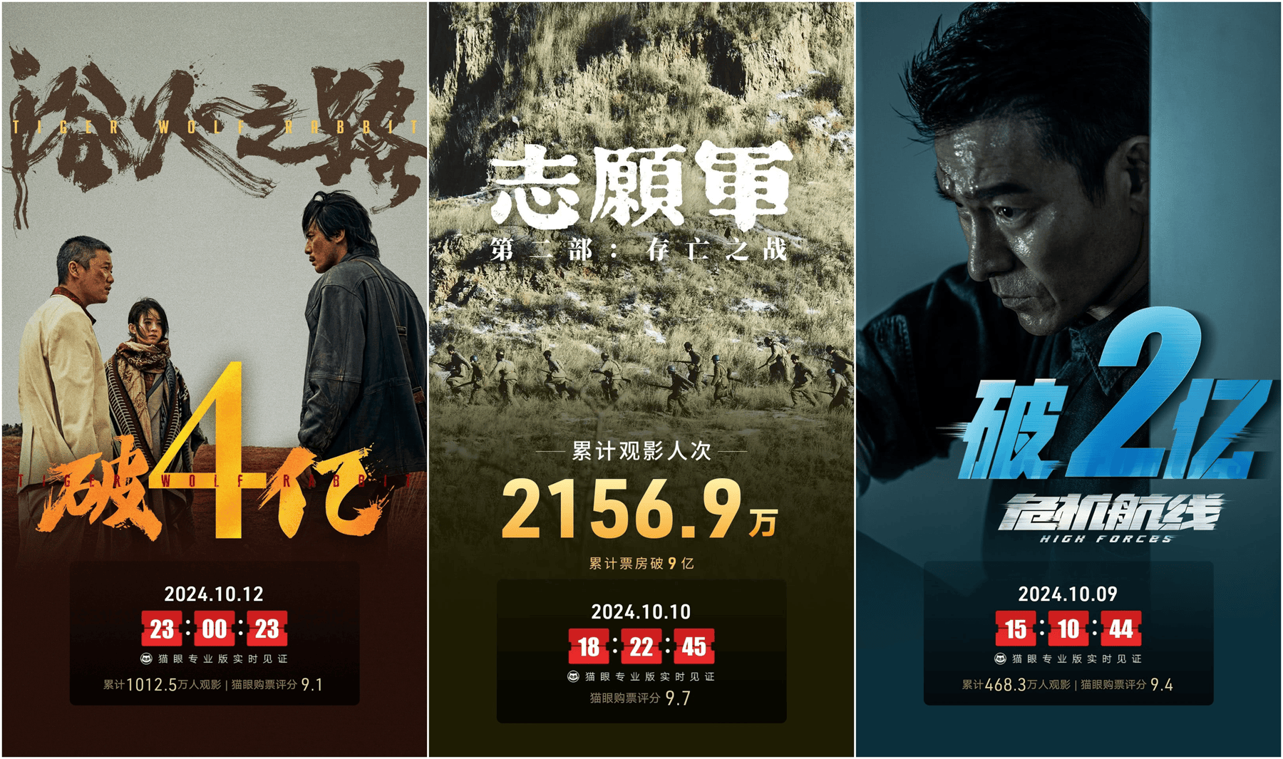 陈凯歌执导,朱一龙、辛柏青、张子枫等主演电影《志愿军:存亡之战》次周收1.93亿蝉联周冠,上映14天累计9.83亿;
