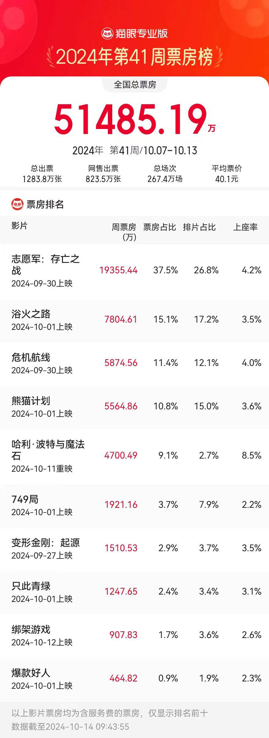 搜狐娱乐讯 据猫眼专业版数据,国庆档热度散去,10.7-10.13内地一周票房报收5.14亿,票房较前一周20.44亿爆跌74.85%。