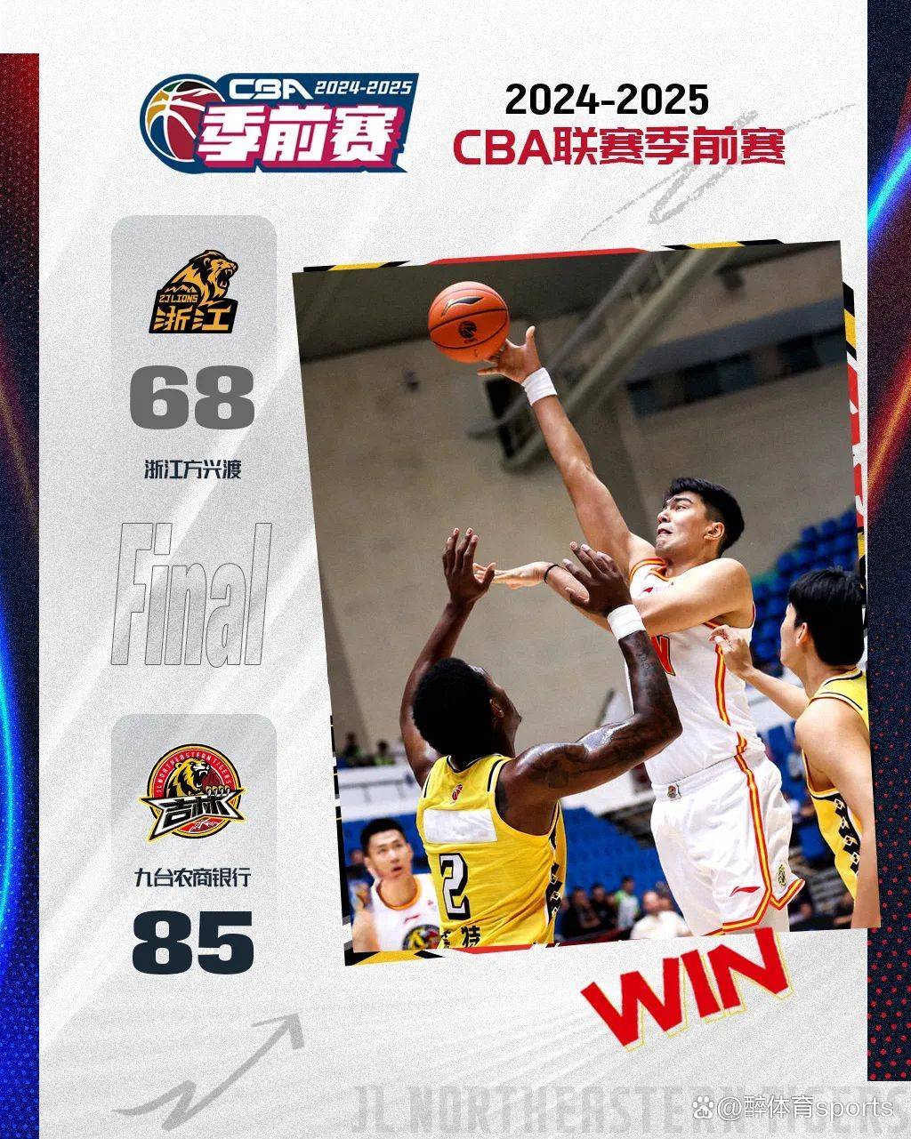 第四节比赛,浙江方兴渡以5-0开局,吴昌泽和姜伟泽连拿5分回应。双方在内线激烈交锋,吴昌泽投篮弹出,鲁吐布拉强势补篮命中,姜宇星三分出手还中,浙江方兴渡叫暂停。许可投进三分稍有起势,姜伟泽马上回敬三分,随后新秀赵嘉浩发挥神勇连得5分锁定胜局。全场比赛结束,全华班吉林东北虎85-68战胜浙江方兴渡。