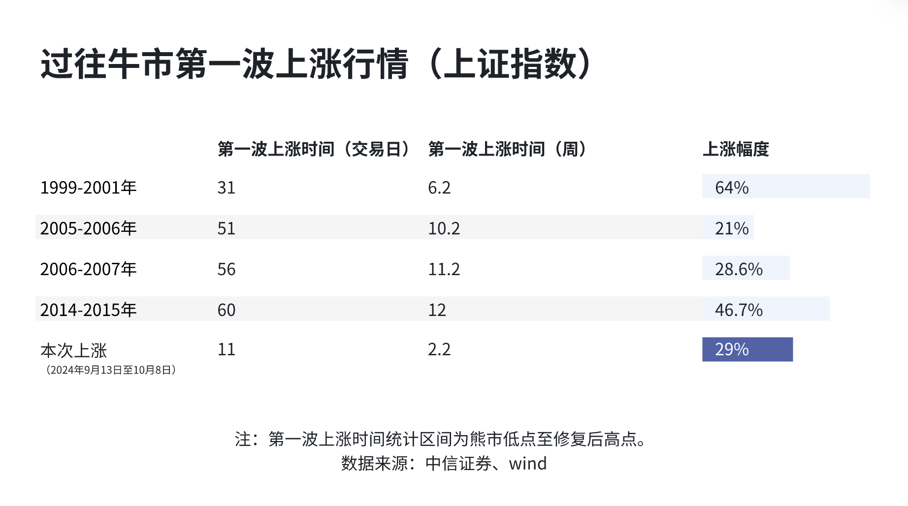 以1999年以来的牛市为例,第一波上涨行情从熊市低点到修复后高点的平均上涨周期为50个交易日左右,平均上涨幅度在40%。而本轮行情在11个交易日左右的时间里,就达到29%的涨幅,时间跨度短,上涨幅度大,走势陡峭。