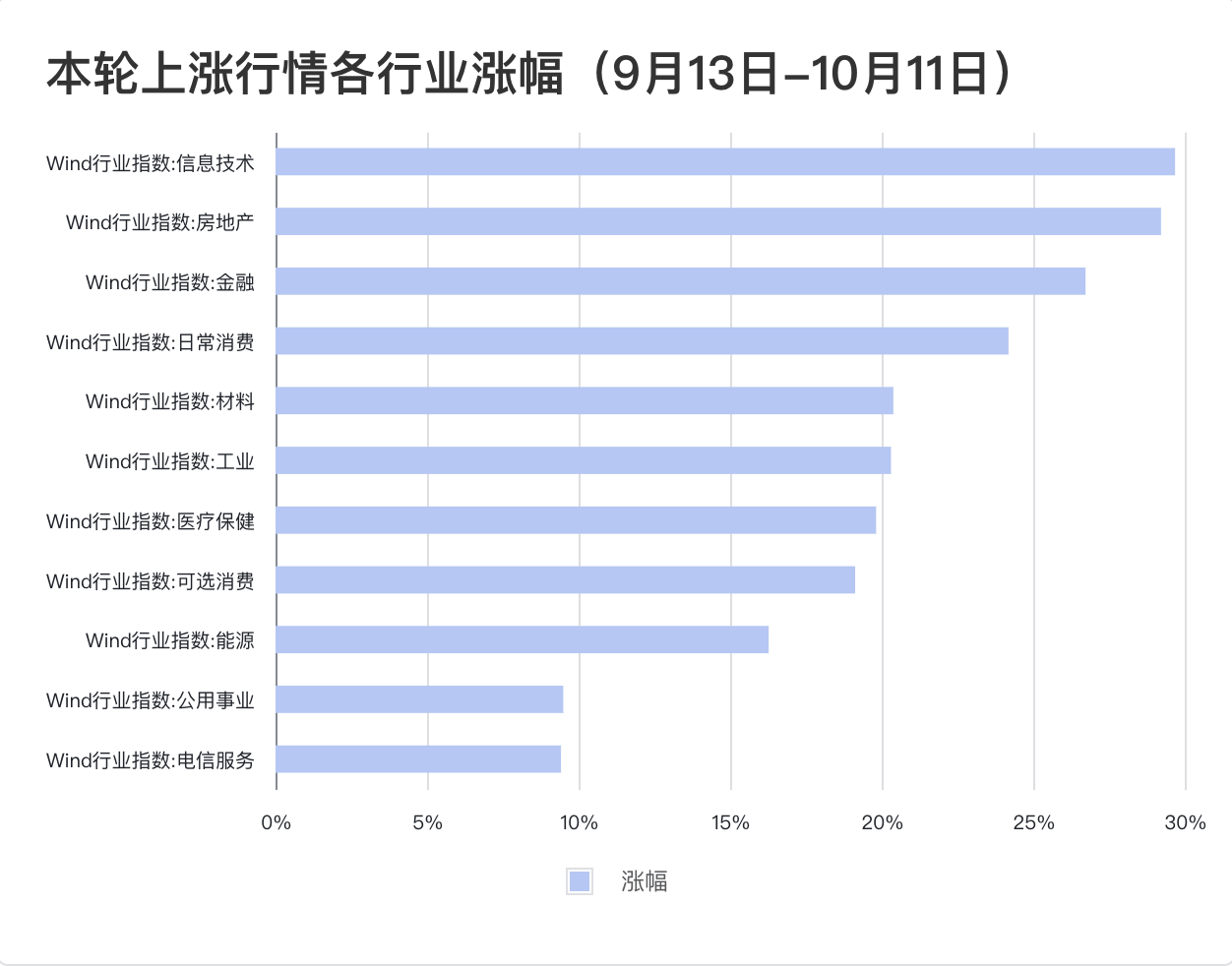 截至10月11日,涨幅居前列的前三大板块分别是信息技术、房地产和金融。