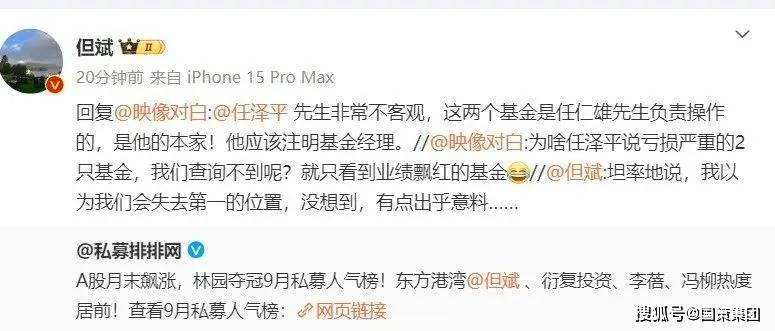 随后,任泽平再次发微博“回怼”,点名但斌公司旗下某只基金产品亏损幅度巨大。