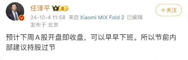 值得注意的是,10月4日,任泽平发微博称,“预计A股开盘即收盘,可以早早下班。所以节前内部建议持股过节。”不过,截至今日,该微博内容已不可见。