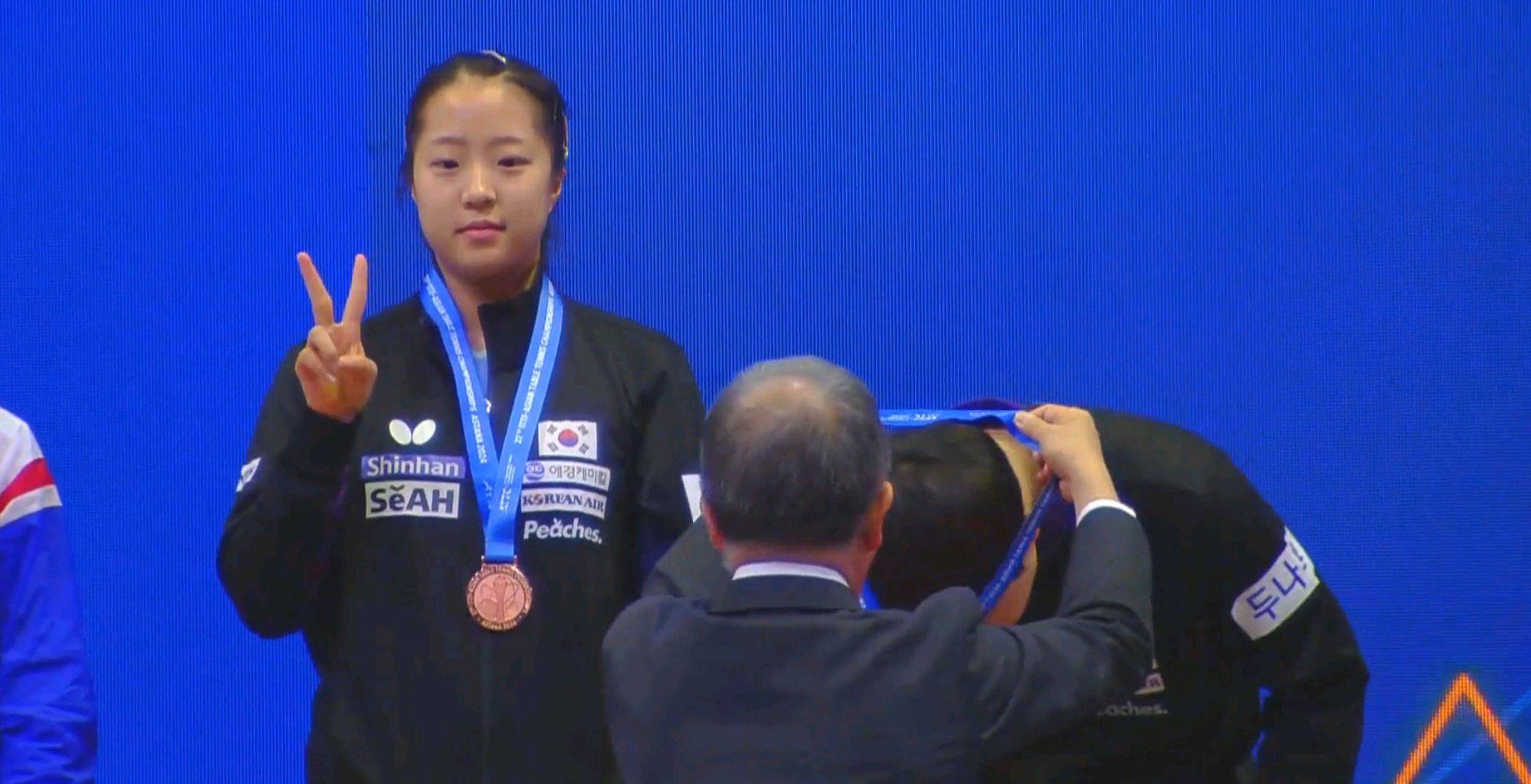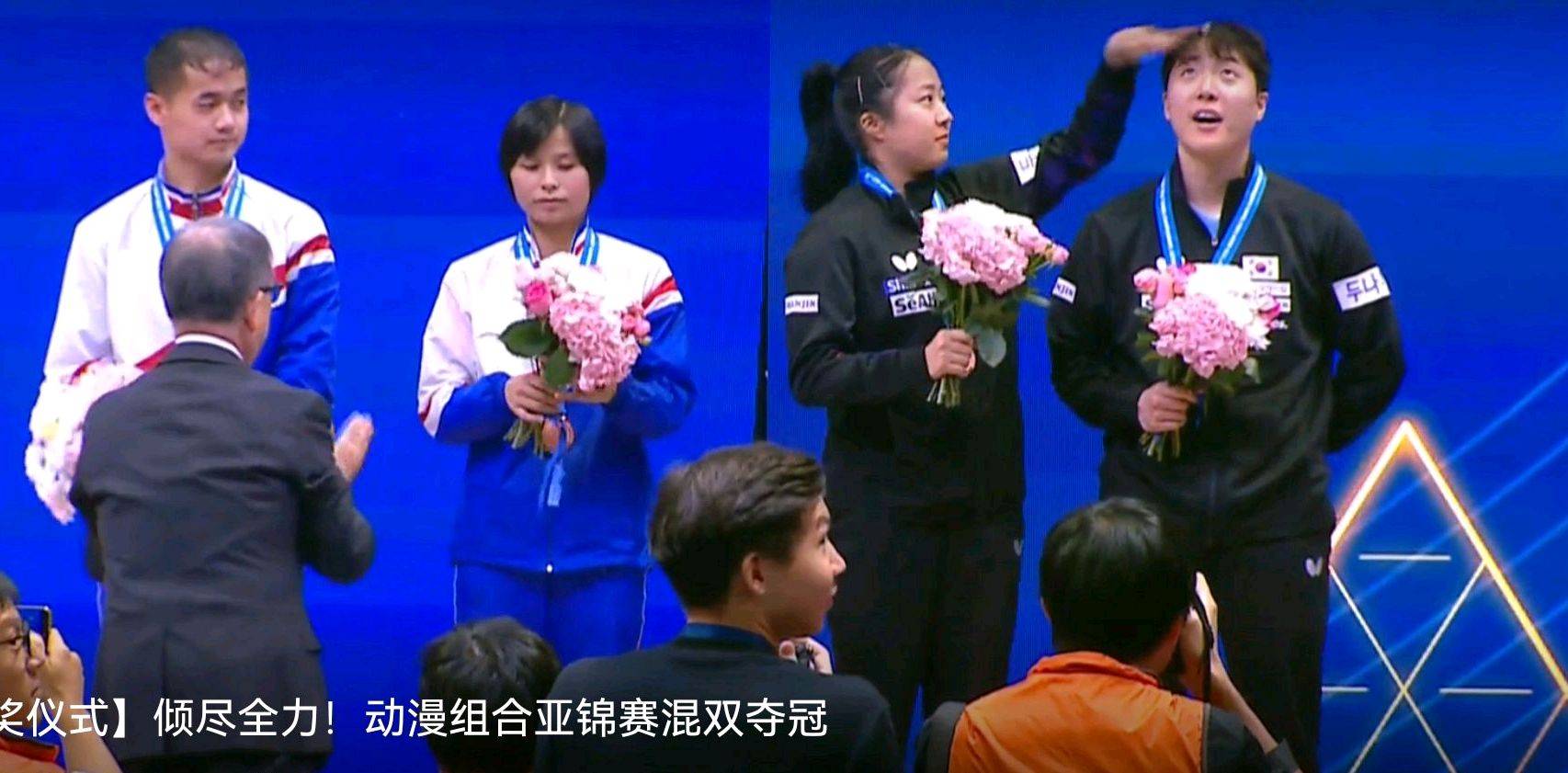 赛后主办方举行了颁奖仪式,只有在这个时候,大家心情最放松吧。亚锦赛的魔鬼赛程让人直呼受不了。颁奖仪式上感觉韩国小将申裕斌最可爱。尽管在半决赛中2-3惜败朝鲜组合李正植和金琴英,但丝毫没有影响小申妹妹的心情,她先是比起了剪刀手,收到嘉宾送给的鲜花,又低头闻闻花儿是不是很香。这还不算,她看到地下有一片花瓣,拿起来放到搭档林钟勋的头上,林钟勋苦笑不得似乎在问,这是什么放我头上,小申妹妹可能后来觉得不好意思,赶紧用手给他弄下来了。两个人没有因为比赛失利而不高兴,他们全程微笑,喜欢这样的小申。