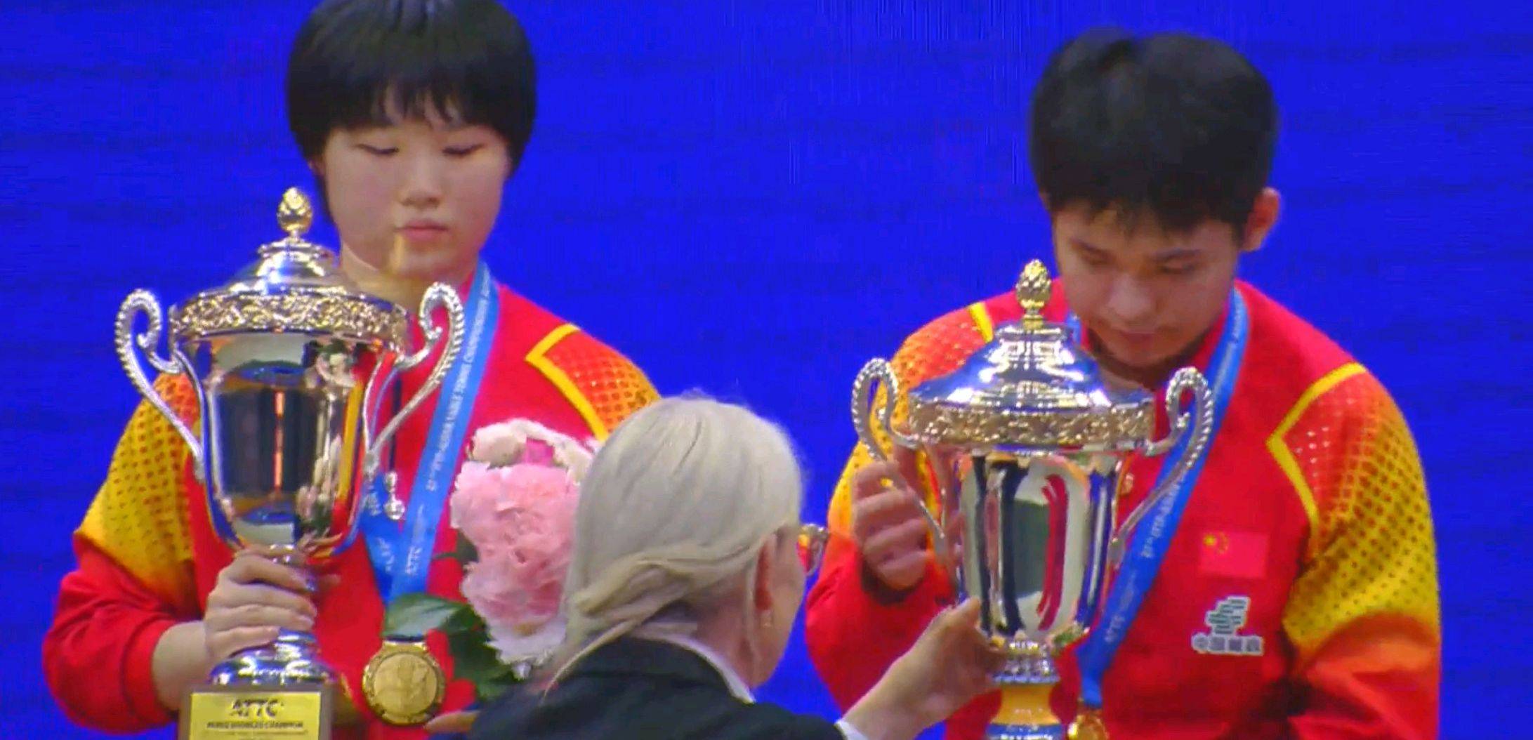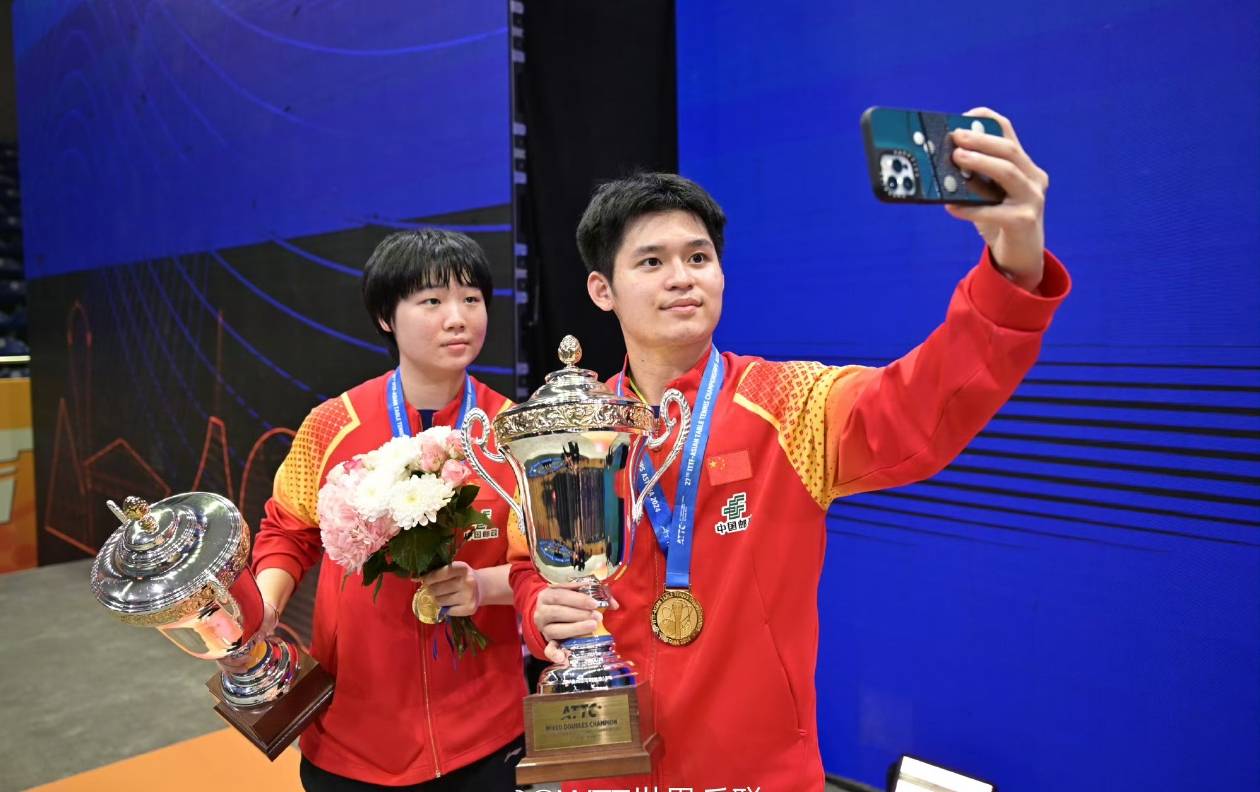 国际乒联主席索林女士给林诗栋蒯曼颁发了鲜花,挂上了金牌还颁发了奖杯,不过两位小将倒是很淡定,他们并没有表现出多么兴奋,颇有大将之风。当然冠军自拍合影,他们还是微笑的。
