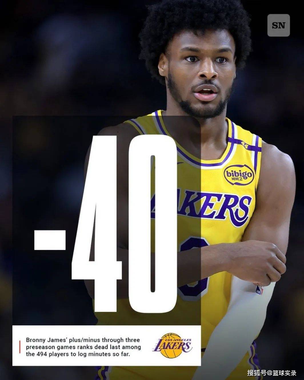 湖人季前赛三场结束,有媒体晒图,截止目前,一共有494名球员在季前赛登过场,其中布朗尼的累计正负值是-40,排在所有球员倒数第一位。