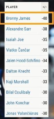 本赛季NBA季前赛正负值排名,布朗尼排名倒数第一