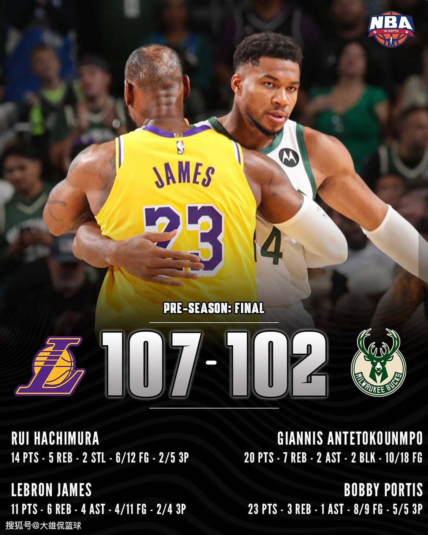 洛杉矶湖人在季前赛的第三场比赛中,以107-102的比分,惊险击败密尔沃基雄鹿。球队在末节一度落后15分的情况下,打出了一波20-0的冲击波,逆转比赛。这是雷迪克执教湖人比赛的首场胜利,赛后,湖人队也是将比赛用球送给了雷迪克。