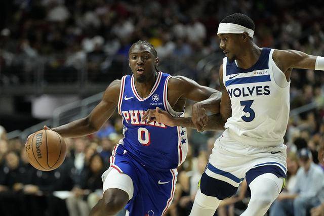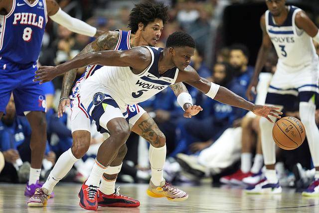 NBA季前赛继续进行,一场东西部焦点战打响,明尼苏达森林狼对阵费城76人。森林狼休赛期完成了一笔大交易,送走唐斯,从尼克斯换来了兰德尔、迪文岑佐、杰弗里斯和一个来自活塞的首轮签。森林狼上一场124-107大胜湖人,拿到季前赛首胜。本场对阵76人,主将爱德华兹登场,新援迪文岑佐也进入先发,与麦克丹尼尔斯、里德、康利组成先发。76人这边乔治、马克西、马丁、乌布雷与德拉蒙德联袂出击。