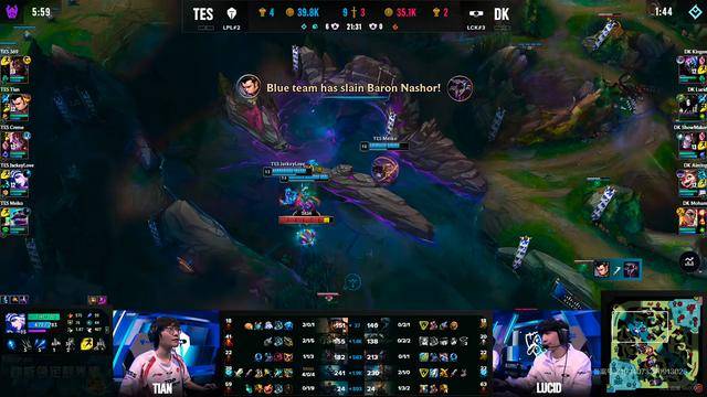 第二组巢虫也被TES控下,打完巢虫后TES下路组换到下路又控下小龙。TES下路推掉DK下路一塔,并在下路开团将DK四人击杀,TES一波大节奏,直接领先DK四千的经济。