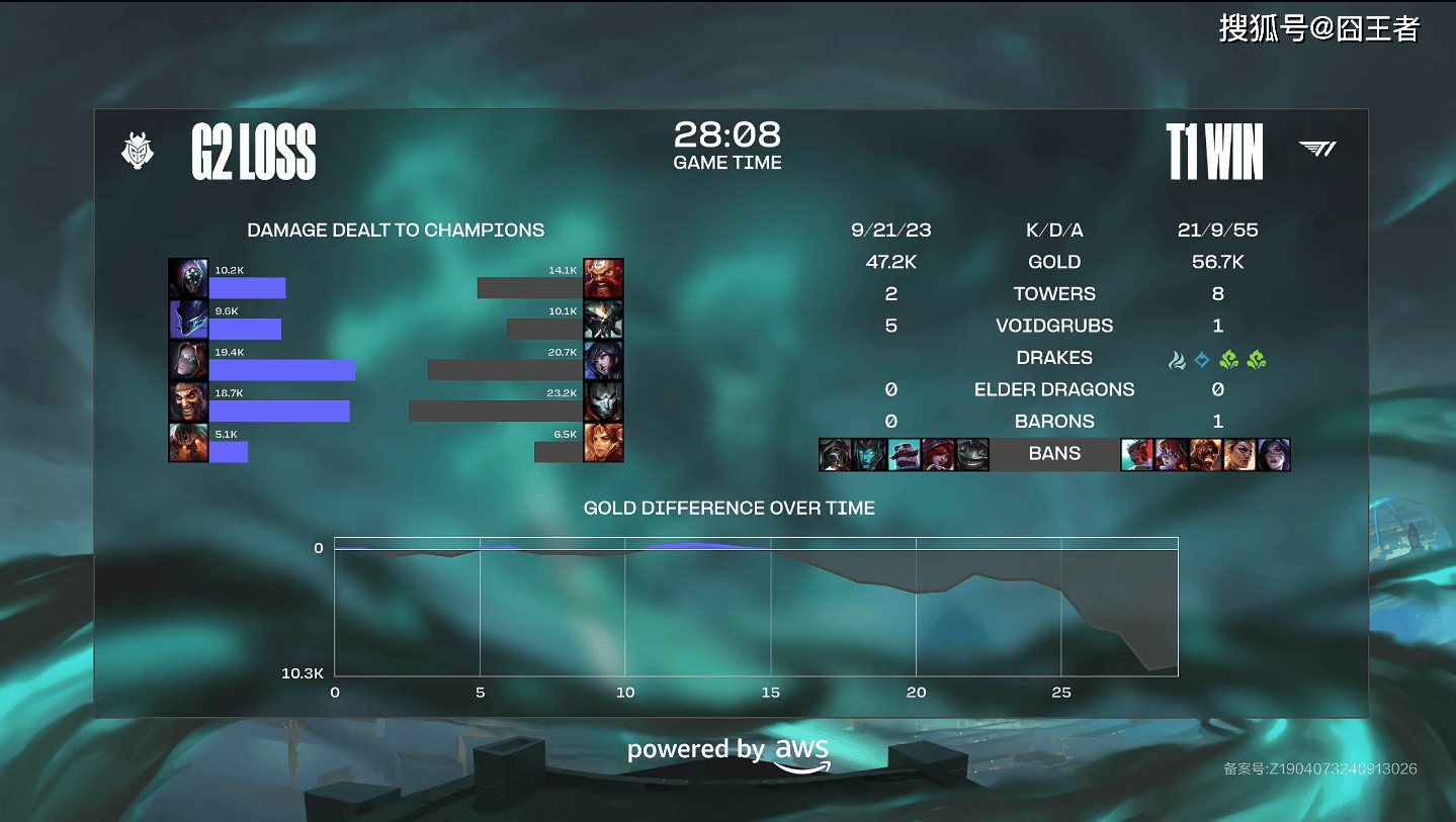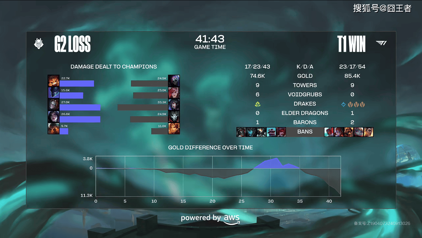 结果第一局比赛,被T1打成了单方面的碾压局。比赛第6分钟左右,Zeus酒桶细腻单杀Hans sama德莱文;比赛第11分钟左右,两队爆发先锋团,Hans sama德莱文双杀两边打成3换3;比赛第17分钟左右,两队爆发小龙团,Brokenblade贾克斯追残血辅助G2正面被T1击溃打出1换2拿下听牌龙;比赛第24分钟左右,T1拉锯中拿下炼金龙魂,后续追击Zeus酒桶闪现炸回Caps发条,T1打出0换2拿下大龙;最终比赛第28分08秒,Zeus酒桶抗住G2集火,Faker阿狸三杀T1一波结束比赛。