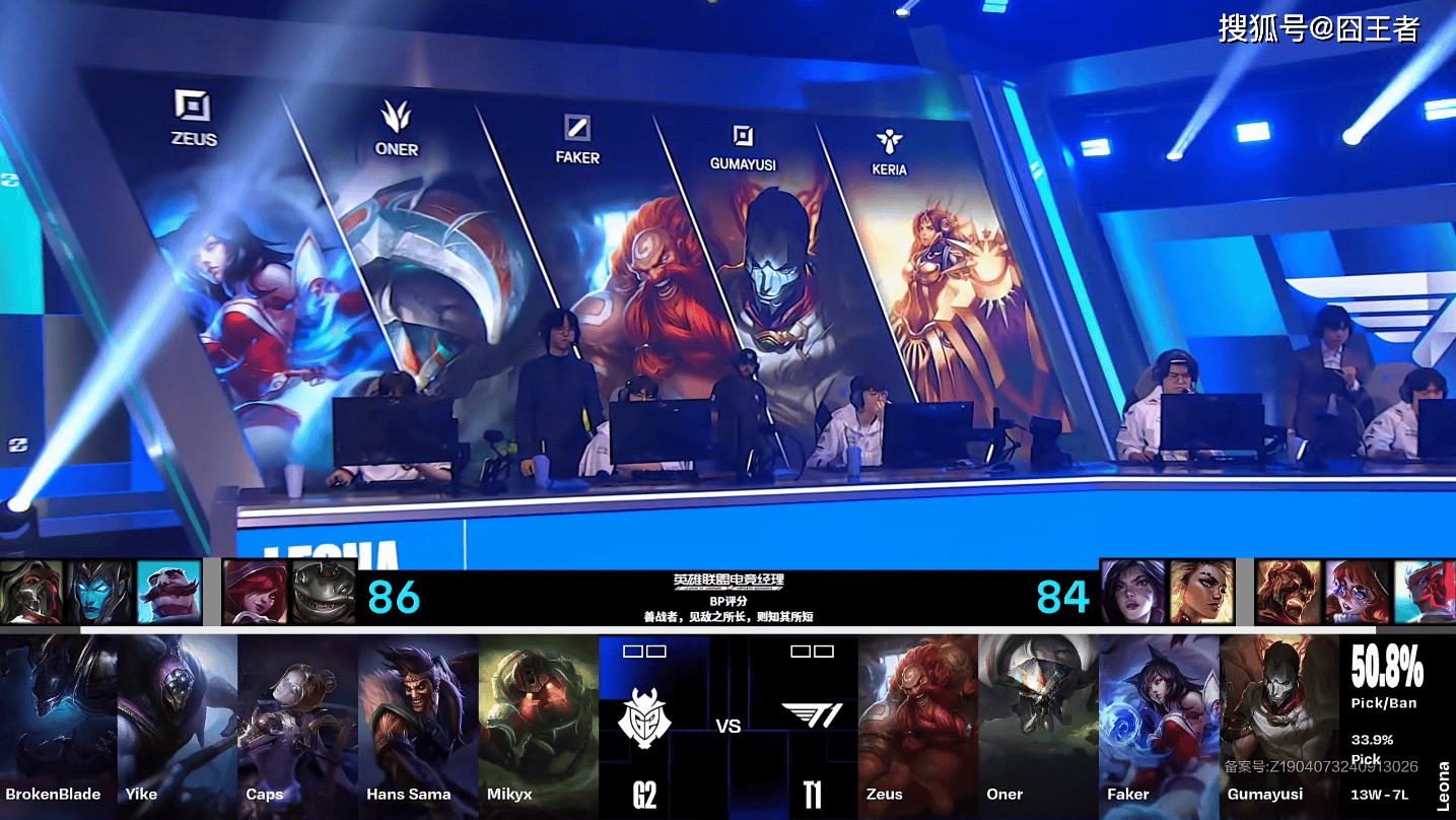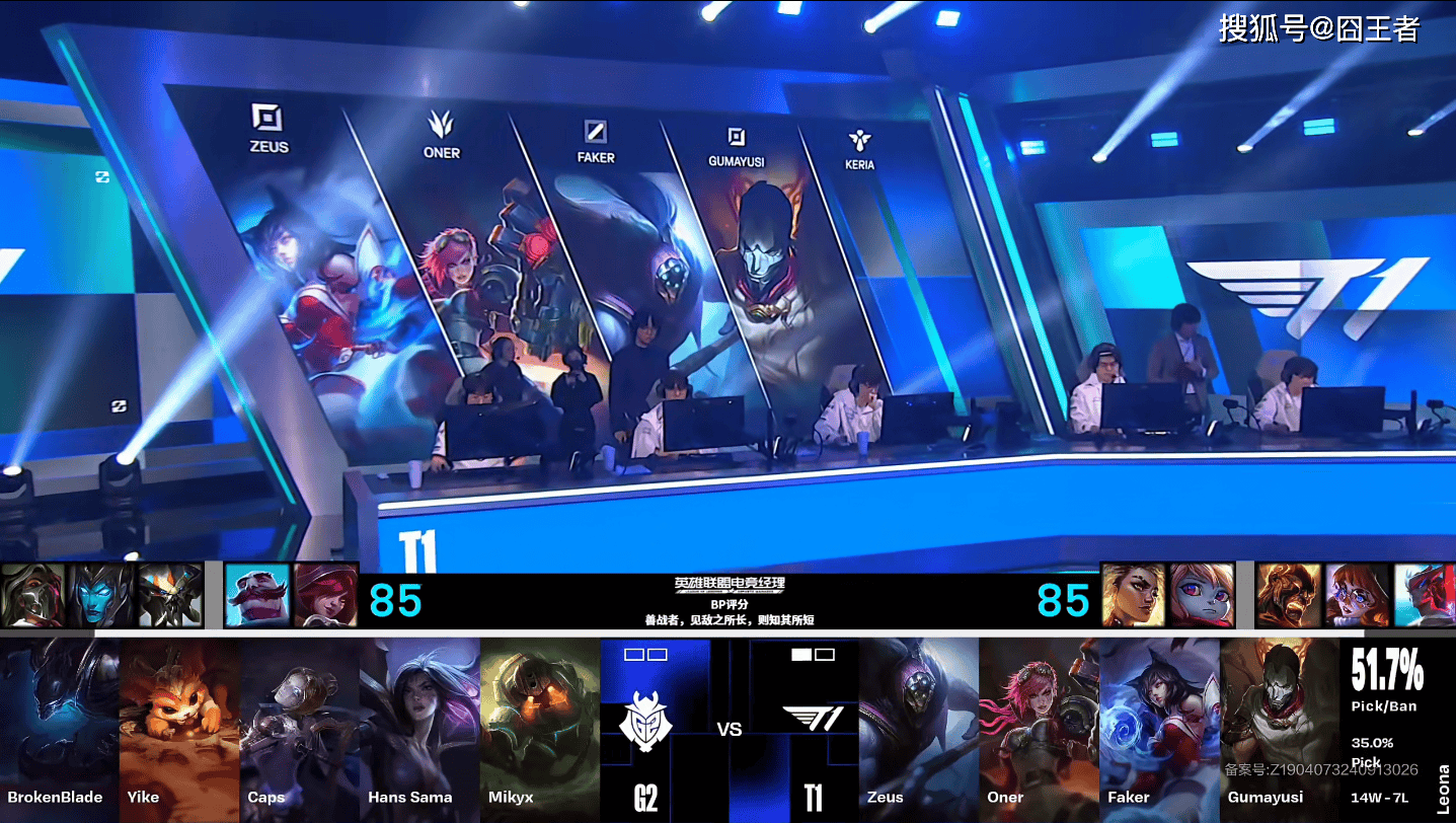 第一局比赛,G2蓝色方,禁用烈娜塔、卡莉斯塔、布隆、霞、塔姆,选用贾克斯、梦魇、发条、德莱文、泰坦;T1红色方,禁用永恩、阿萝拉、火男、芮尔、卡莎,选用酒桶、蝎子、阿狸、烬、蕾欧娜
