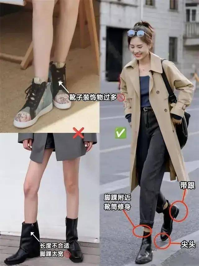 喜欢穿短靴的话靴,靴子装饰物不能太多,也跟衣服同一个道理,太繁琐的衣服穿起来很挑人,很难驾驭,长度也要适合才行,例如下面左边的这双黑色短靴,设计阔以复杂,而且脚踝的位置设计也太宽松,穿在脚上,然后根本就不好看。
