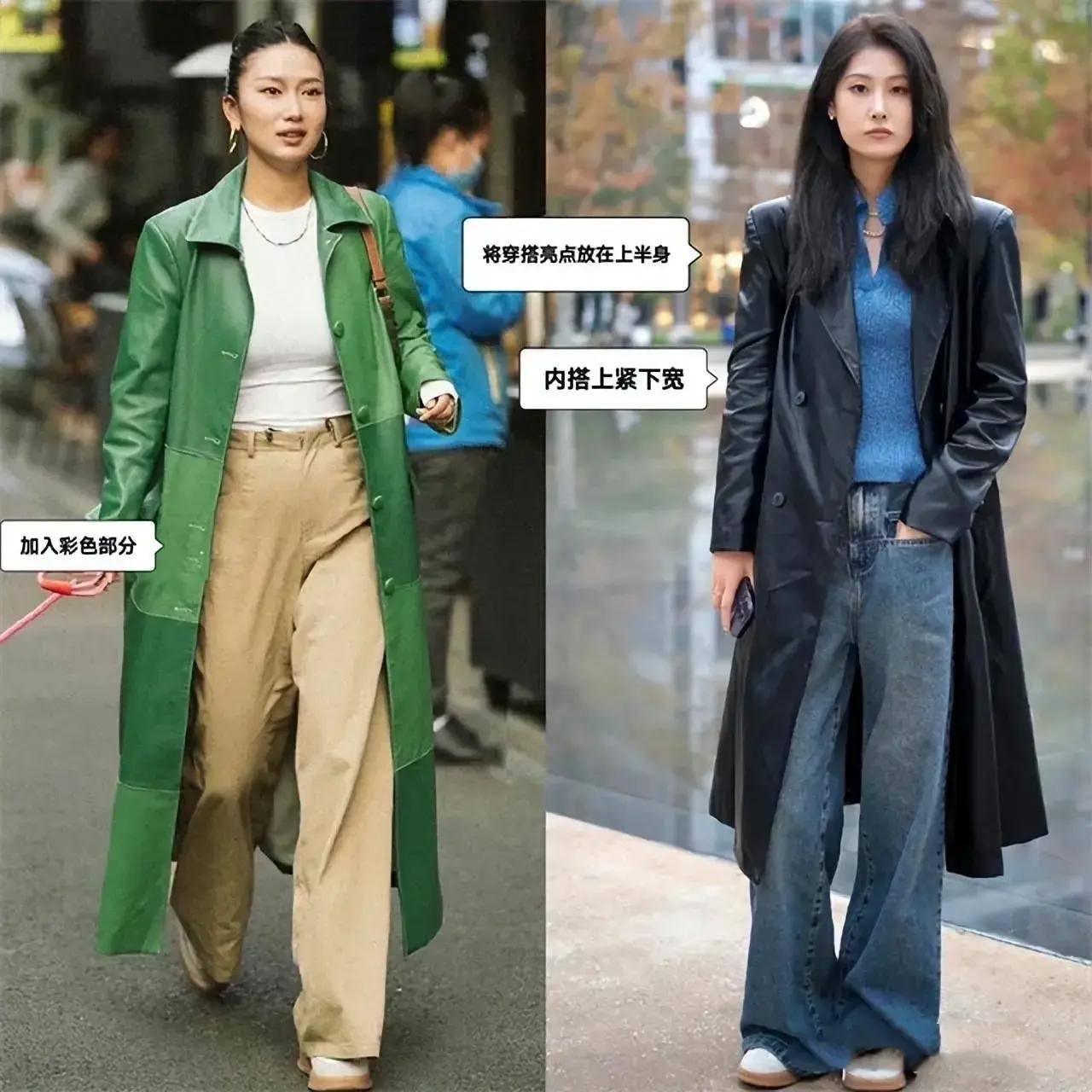 如果你选择的是长裤搭配上风衣的话,就要根据你选择的裤子款式不同,选择的鞋子也有很大的区别,例如下面这位素人博主用的是黑色的风衣外套,搭配上一款牛仔阔腿裤,而且裤子比较长,有点拖地的感觉,这个时候应该选择小白鞋,休闲鞋的搭配,才能呈现出种慵懒的视觉效果。