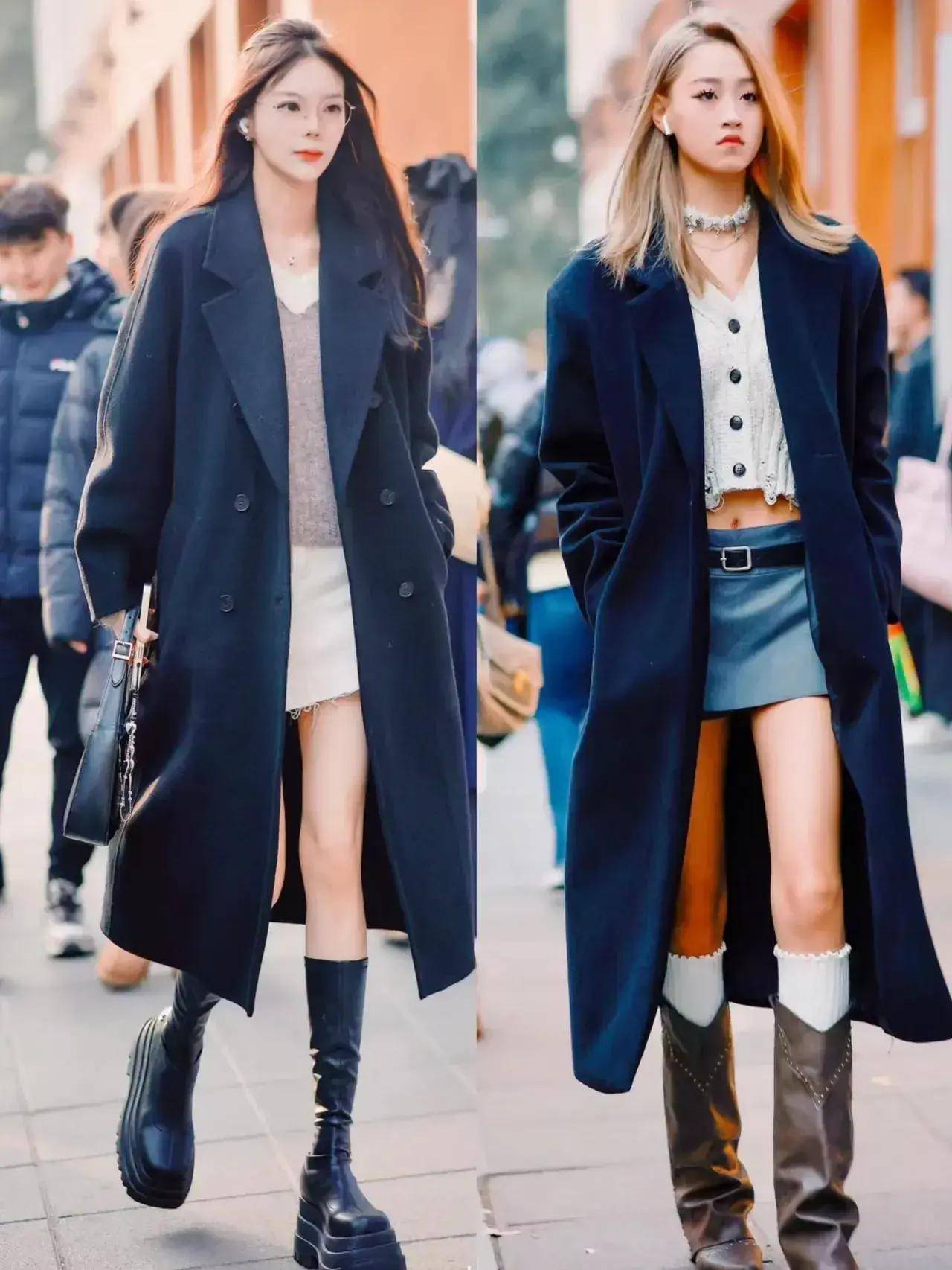 当然也不能避免说所有人都选择长裙来搭配,毕竟像00后的美少女,身材比例非常好,有着一双笔直修长的美腿,例如像下面这两位素人,就用一件大衣外套搭配上白色的短裙和蓝色的短裙,脚上再踩着一双中筒靴,轻轻松松就能把竹竿腿呈现出来,抢眼又抢镜。