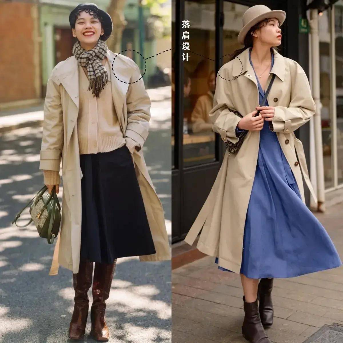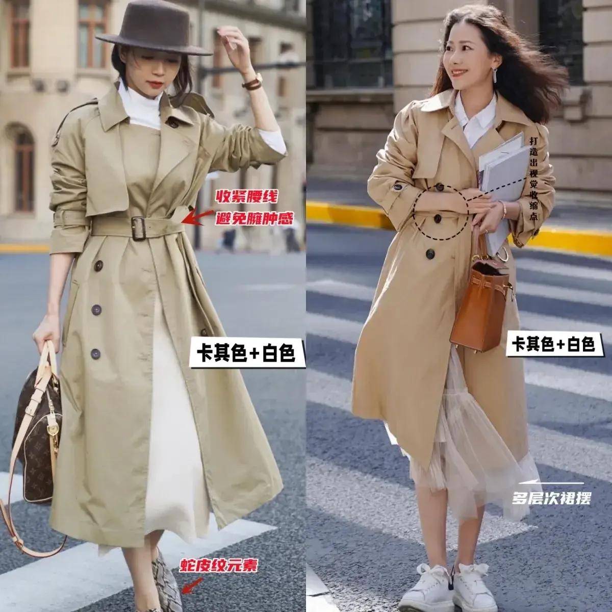 例如下面这两位素人博主选择的是卡其色的风衣外套,内搭一件白色的打底衫和半身裙,另一位使用卡其色的风衣搭配上薄纱半身裙,两套穿衣造型呈现出来的视觉效果都很大气,优雅得体。