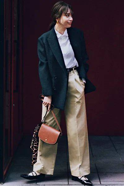 浅米色为主调,柔和不刺眼,提升了造型的包容度,完美契合亚洲人的肤色。西装的质感挺括但并不显得过于硬朗,袖口稍作挽起,体现了高智感穿搭不刻意的精致。