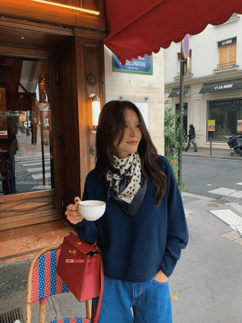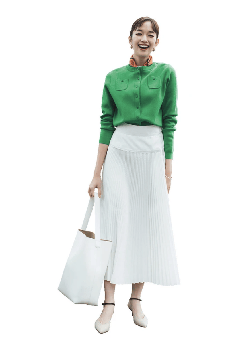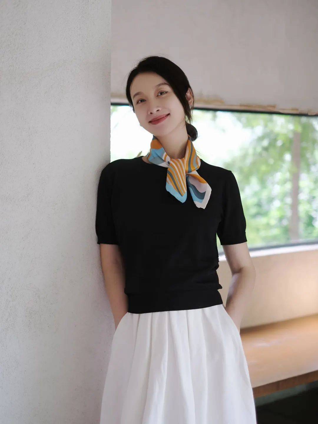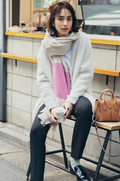 此外,亚洲人的身形多偏向纤瘦,V领或圆领针织衫能修饰颈部线条,丝巾则以松散围绕的方式自然垂落,避免过于紧凑的系法,这样可以拉长颈部线条。