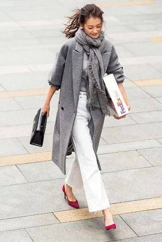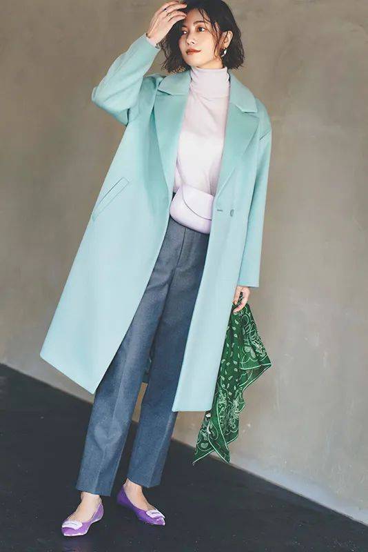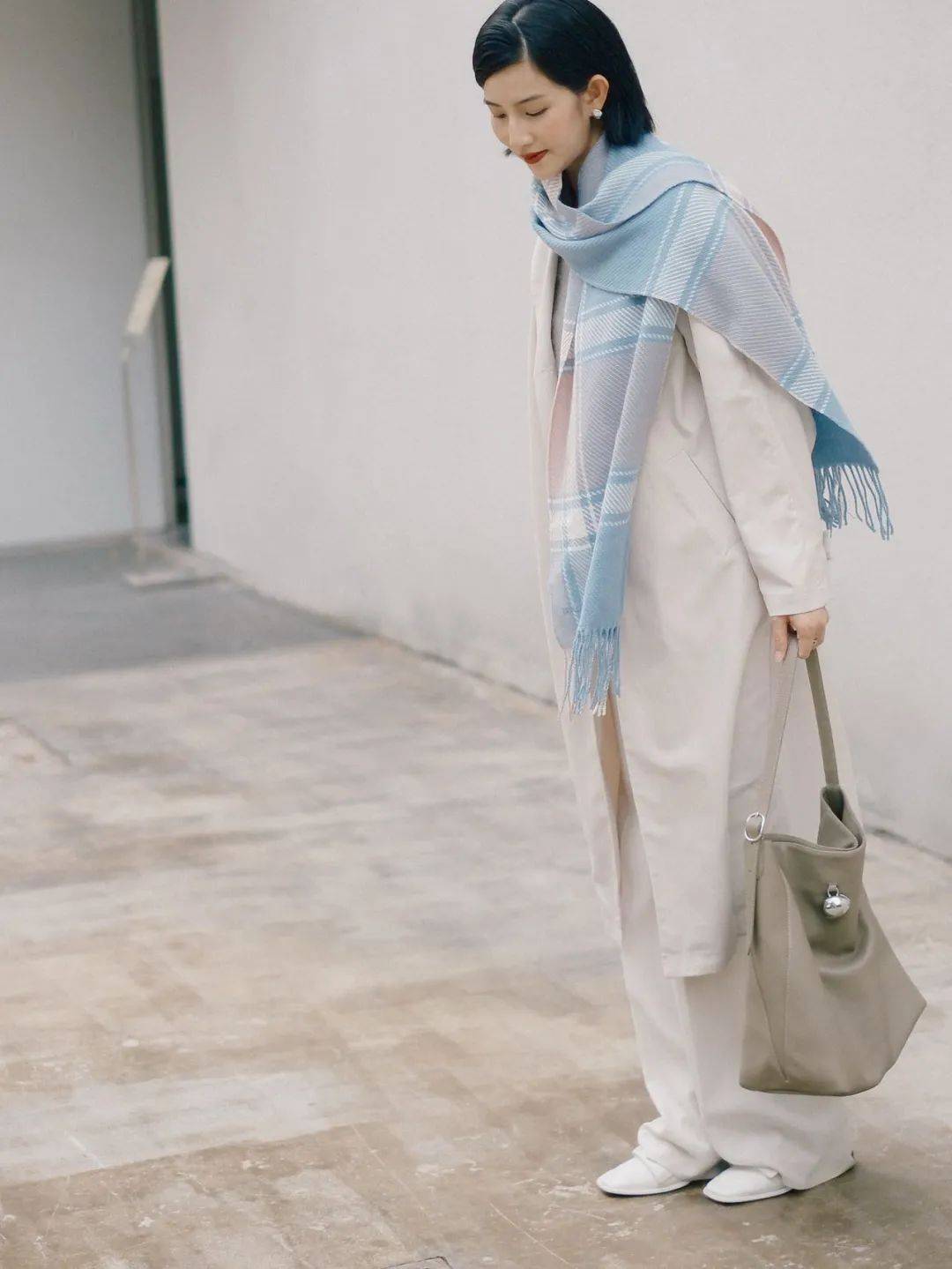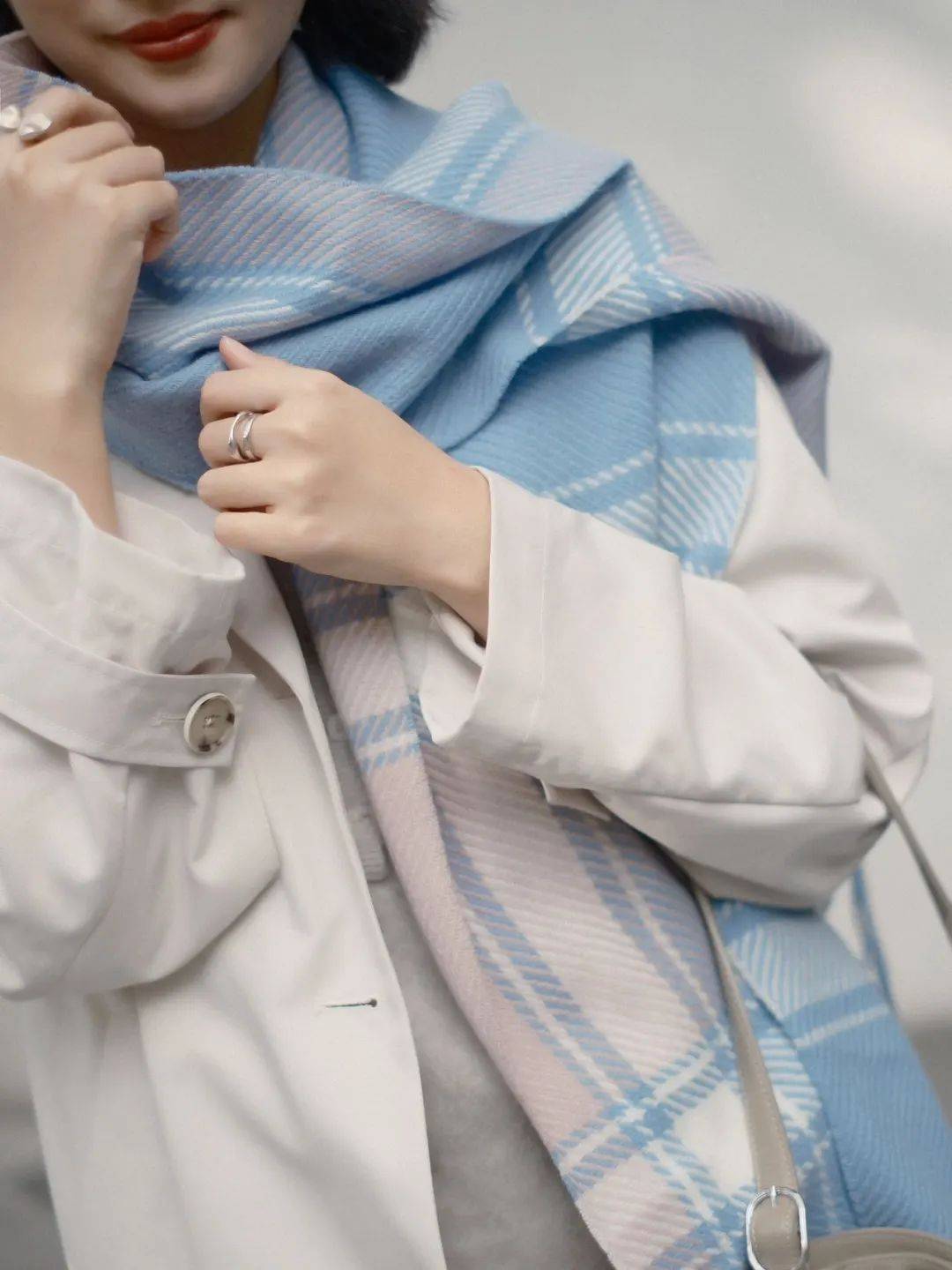 博主选择了温暖的米白色大衣,而围巾的淡蓝色与粉色经过巧妙调和,既不会过于抢眼,又非常契合高智感穿搭调性,保持了造型的沉稳内敛,同时通过围巾的色彩打破了单一色调的沉闷。