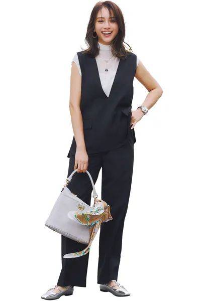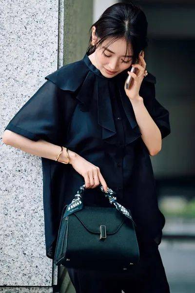 搭配法则:这种色彩组合对亚洲人很友好,黑色针织衫作为基础单品,适合大部分亚洲人肤色,而丝巾的局部提亮,又不会过于跳跃,保持了和谐与自然的视觉效果。