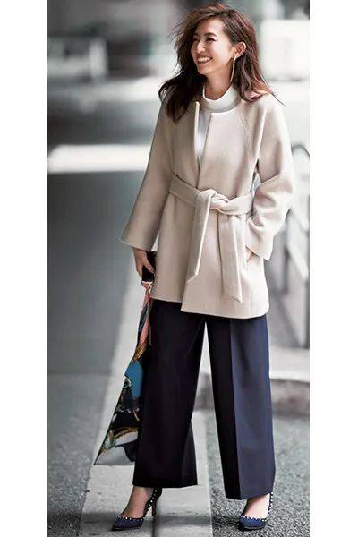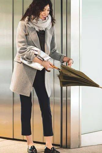 不限肤色和身材都可尝试的百搭模版:在秋冬叠穿中,选择一件米白色修身衬衫外搭驼色大衣,并在颈间系一条有细小几何纹路的浅灰色丝巾。