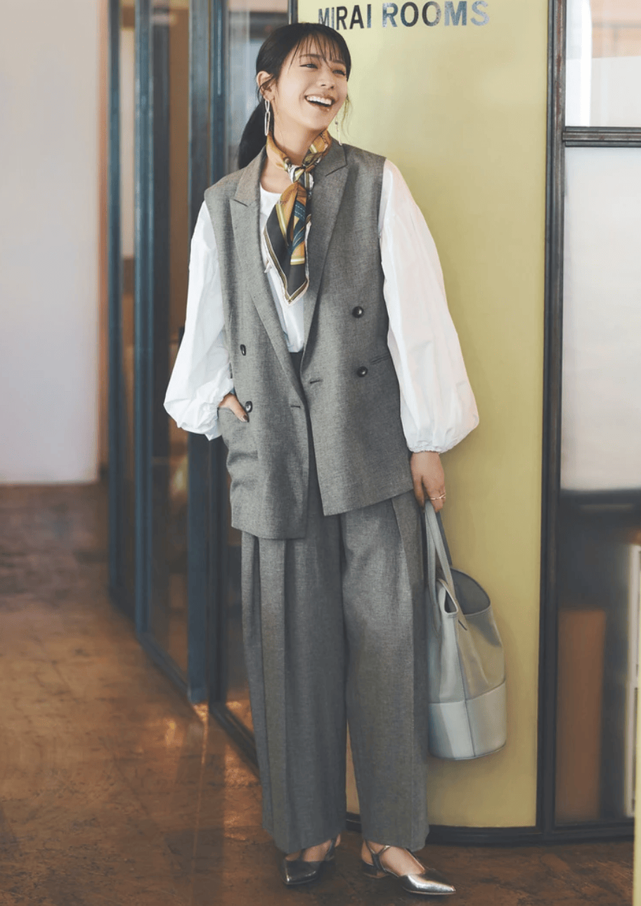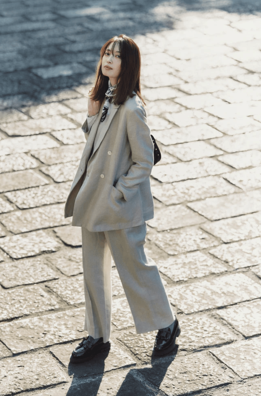 对于身形偏瘦或中等身材的亚洲人来说,廓形西装的宽松剪裁能够修饰肩线和身材比例,而丝巾的垂感可以进一步拉长整体比例,营造出修长的视觉效果。