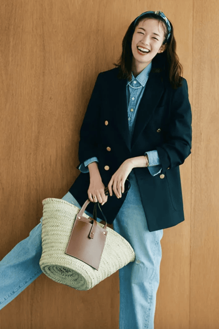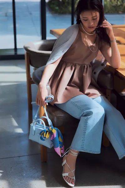 闲暇的周末咖啡时光,廓形西装与丝巾的组合展现出另一种舒适与松弛的面貌。宽松的西装包容性很强,搭配一条带有几何花型的丝巾,轻披在肩上,随性且有层次感的搭配,既不会显得过于正式又能展现独特品味。