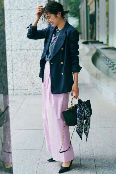 社交聚会中,环境比较轻松,选择稍微跳跃的撞色丝巾,比如淡粉色或浅蓝色,增添一点活力与趣味。而廓形西装则保持其结构感与挺括感,让穿着者在人群中脱颖而出。
