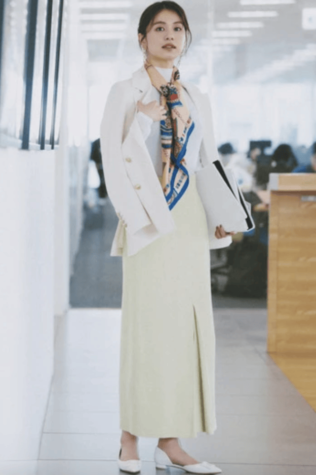 在商务会议中,米白色针织衫与中性色丝巾的搭配,可以让你轻松游走于正式与非正式之间,展现得体大方的职业气息。