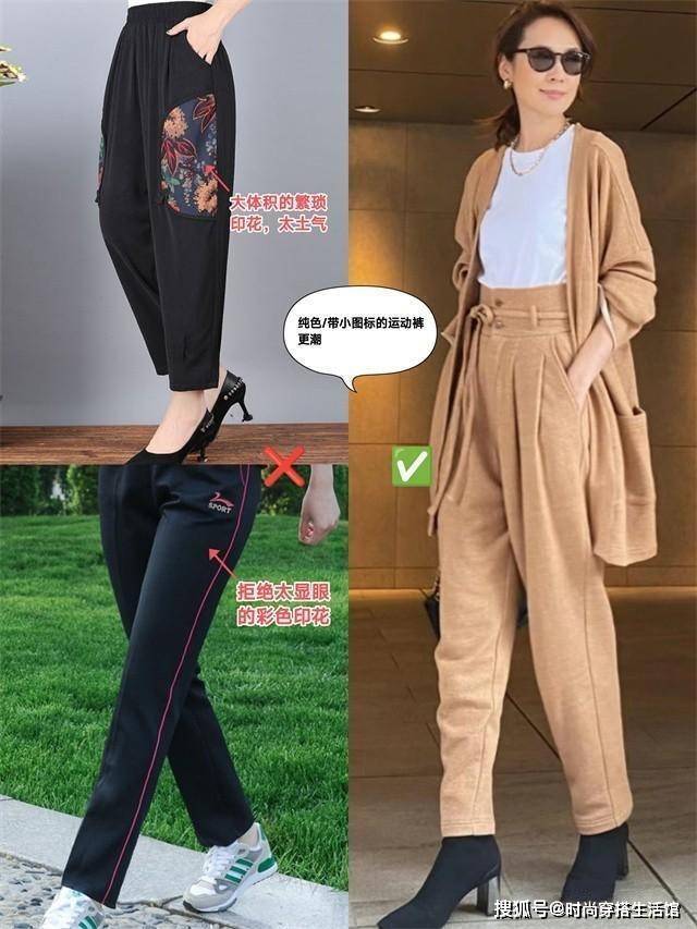 其次就是在运动裤的颜色选择上,很多女性在上了年纪之后,会越来越喜欢带有花色的裤子,而将花色融入到运动裤中无疑是一个雷区,不仅会显得老土俗气,还会拉低造型的档次。更建议大家多尝试配色干净素雅一些的纯色运动裤,看起来更加的高级简约也能提升时尚感。