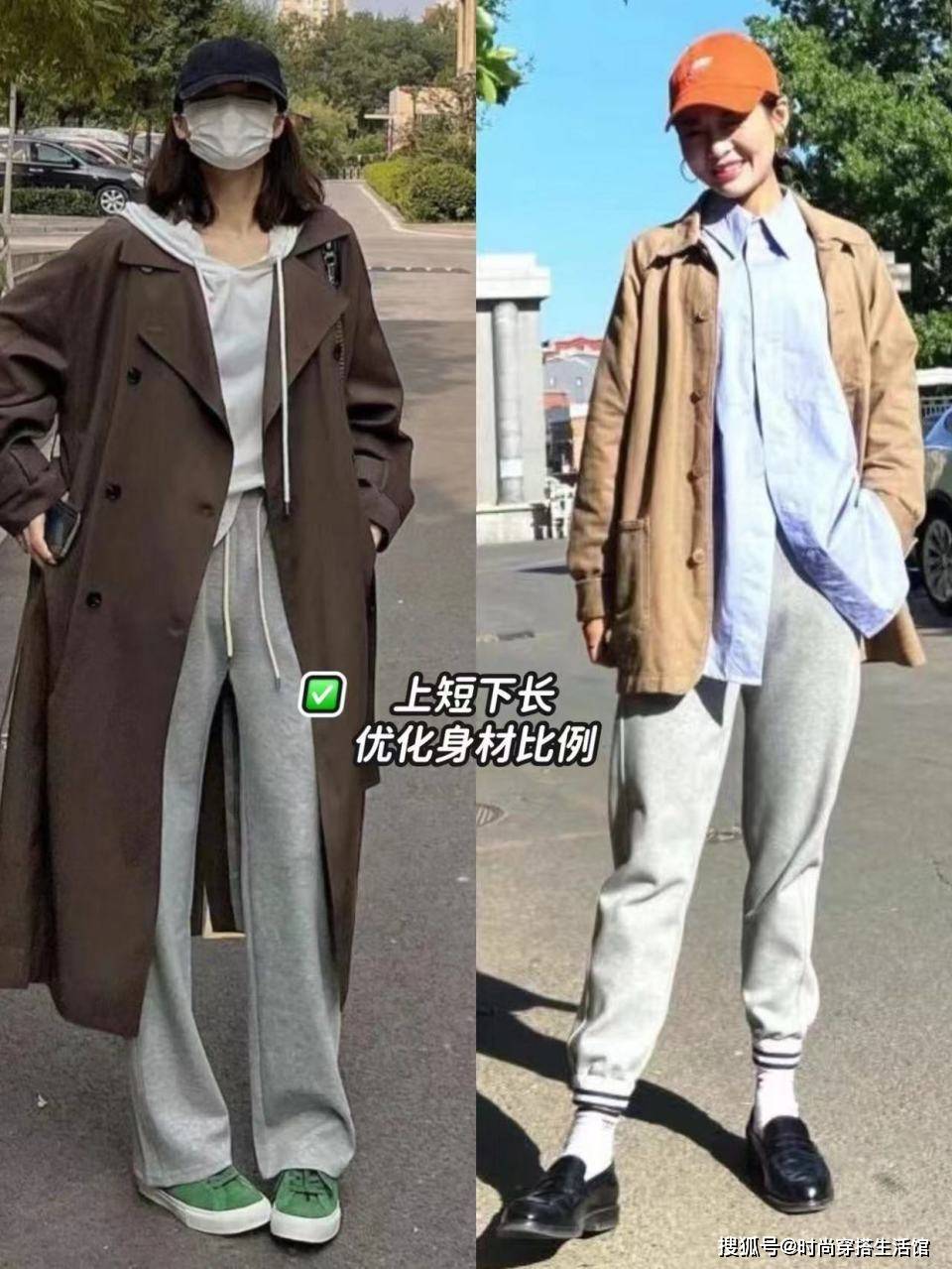 在实际搭配过程当中,我们要去明确地划分我们的腰身,拒绝去压低我们的个子,就像穿风衣的时候,也许大家还是会关注到内搭怎么挑选,所以你要选择短内搭配合这种高腰的运动裤,才能够用这种上短下长的方式去拉长我们的比例,体现你的小蛮腰和大长腿。
