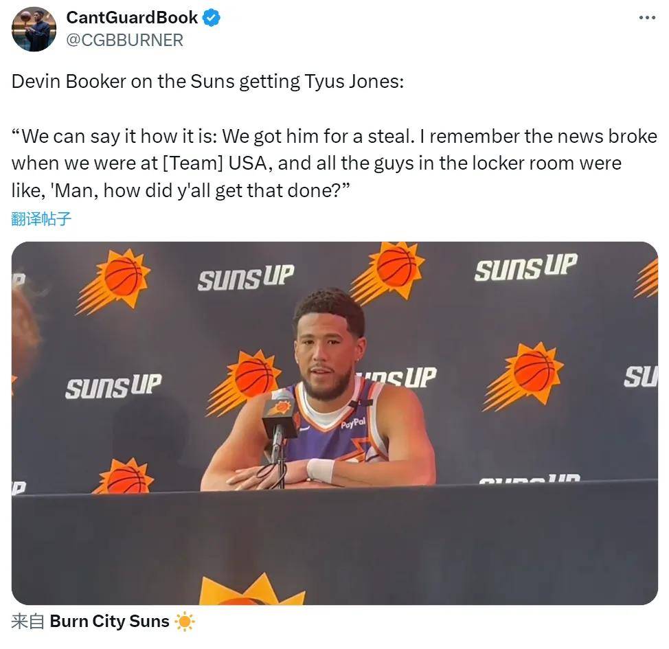 在太阳队新赛季的媒体日上,布克接受采访,谈到球队新援泰厄斯-琼斯:“太阳得到琼斯是一次抢劫,我对此非常兴奋。签约的消息曝出来时,我还在美国男篮,更衣室里所有人都很惊讶!他们问我,‘伙计,你们是怎么做到的?’”